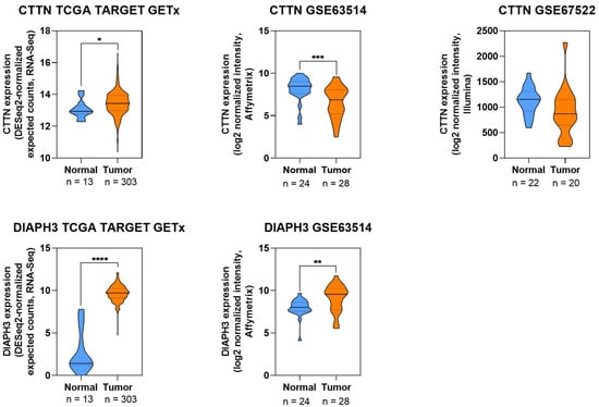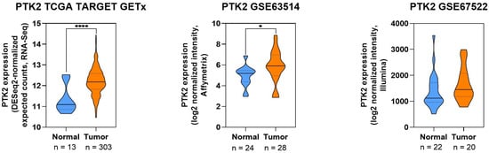 Although not part of the scoping review methodology per se, complementary analyses were performed using publicly available transcriptomic datasets (TCGA, GSE63514, GSE67522) to visualize the expression of key adhesion-related proteins (integrins, FA/FAK, and ABPs) in CC versus normal tissues. The data were used to visualize general expression. Differences in expression levels between groups (cancer vs. normal tissue) were assessed using parametric tests (unpaired t test with Welch’s correction) and nonparametric tests (Mann–Whitney U test) after assessing the sampling distribution (Shapiro–Wilk test). The significance level was set at 0.05, and the analysis was performed in GraphPadPrism 8.