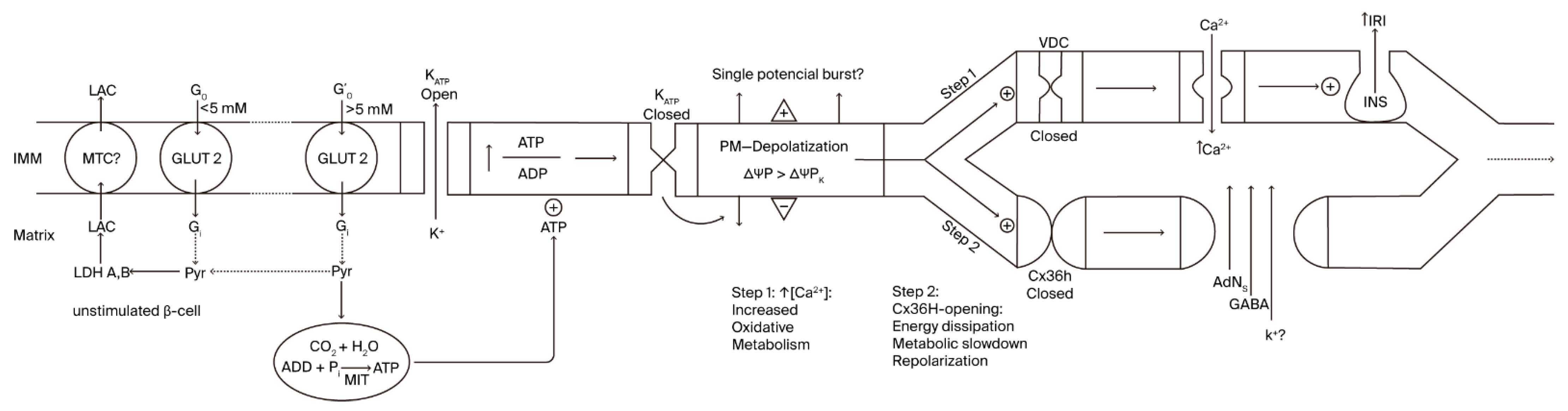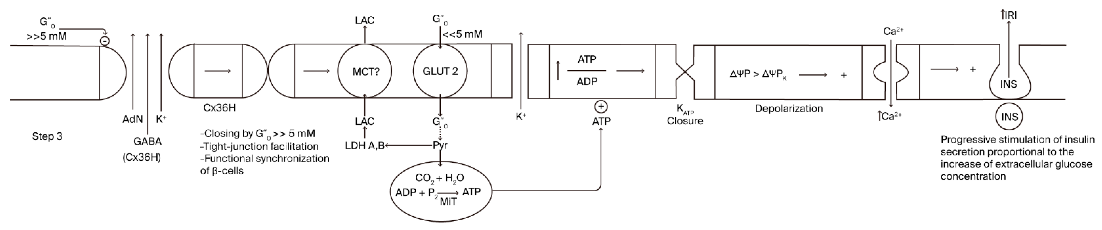As the extracellular glucose concentration continues to increase (>>5 mM), it enters a range of hyperbolic Cx36 hemi-channel inhibition, which leads to the progressive closing of the hemichannels, dependent on the final glucose concentration reached. This makes possible a partial or maximum recovery of Step 1 and all its components: K+ATP-closure by a recovered glucose metabolism, membrane depolarization, and an increase in cytosolic Ca2+ concentration that allows for the continuous stimulation of insulin secretion (2nd second phase?). The insulin response will return spontaneously to basal values when the extracellular glucose declines back to its basal concentration (5 mM): the corresponding suppression of glucose metabolism will proportionally decrease OxPhos, the cytosolic ATP/ADP ratio, and the stimulation of insulin secretion.