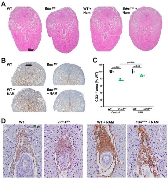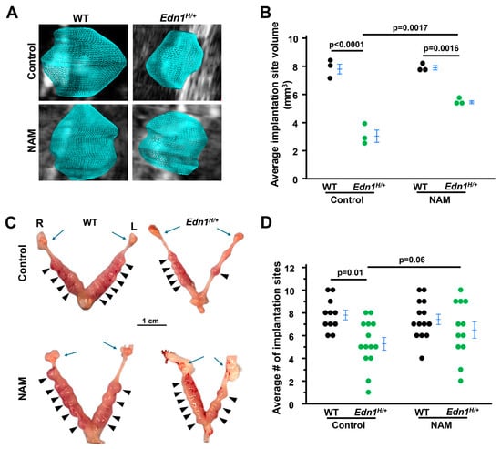 3.1. The Decrease in Implantation Site Volume in Edn1H/+ Dams Is Prevented by NAM Treatment