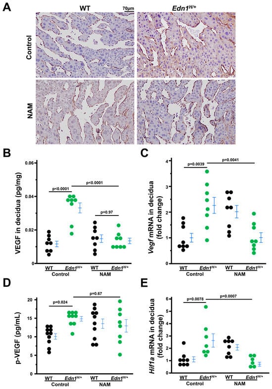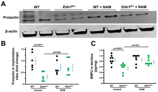 3.4. Decidualization Is Impaired in Edn1H/+ Dams, Which Is Mitigated by NAM