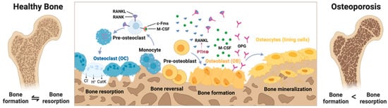 Bone homeostasis in healthy bones is an accurately adjusted equilibrium between the degradation of osseous substance by osteoclasts, the formation of new bone by osteoblasts, and the following mineralization process orchestrated by osteocytes (Figure 1). This process is mediated by the interaction between receptor activator of nuclear factor κB (RANK) on osteoclast precursors and its ligand RANKL, which is expressed by osteoblasts and stromal cells. Osteoblasts also secrete macrophage colony-stimulating factor (M-CSF), which, together with RANKL, recruits osteoclast precursors and promotes their differentiation and maturation into functional osteoclasts, thereby regulating bone (Figure 1). The bone remodeling process contributes to stability by helping bones adapt to mechanical load and regulates serum calcium levels. Resorption of bone is mediated by Ca2+ sensors in the parathyroid gland by secretion of parathyroid hormone (PTH) if Ca2+ levels are low. Subsequently, osteoblasts respond by secreting RANKL, triggering osteoclasts to secrete protons and activate H+-ATPase, which breaks down hydroxyapatite. To resorb the organic substance, osteoclasts secrete proteases such as cathepsin K, degrading the extracellular matrix. Furthermore, bone resorption can be enhanced by elevated levels of activated vitamin D3, which promotes calcium absorption and regulates calcium homeostasis. Conversely, osteoblasts secrete osteoprotegerin (OPG) in response to calcitonin, which acts as a decoy receptor for RANKL, thereby inhibiting the differentiation and activity of osteoclasts and reducing bone resorption [12]. In summary, PTH and activated vitamin D3 are released when serum calcium levels are low and initiate the breakdown of bone, while calcitonin stops this process when serum calcium levels increase. The following section describes the pathological processes if this equilibrium is disturbed [9].