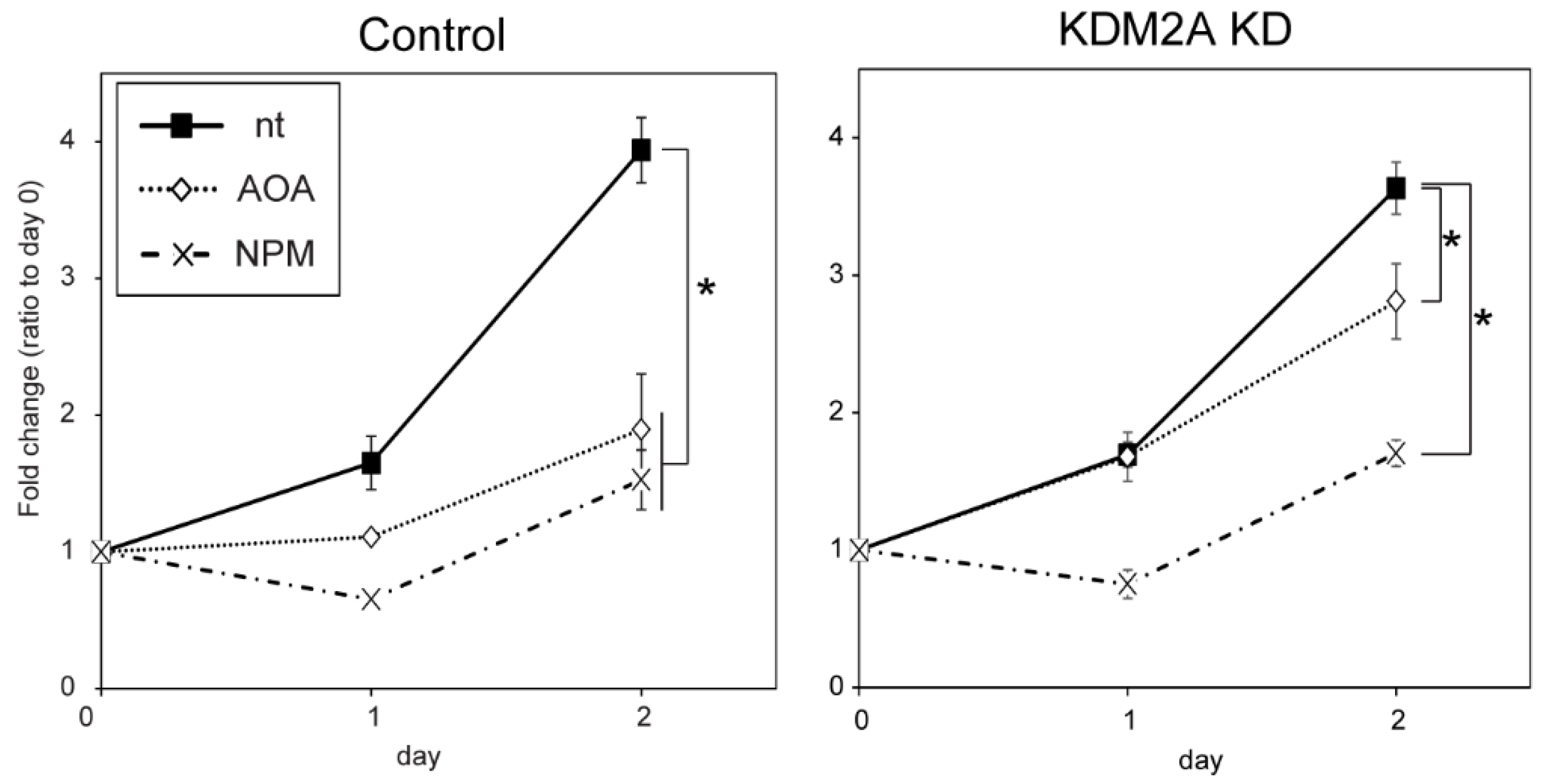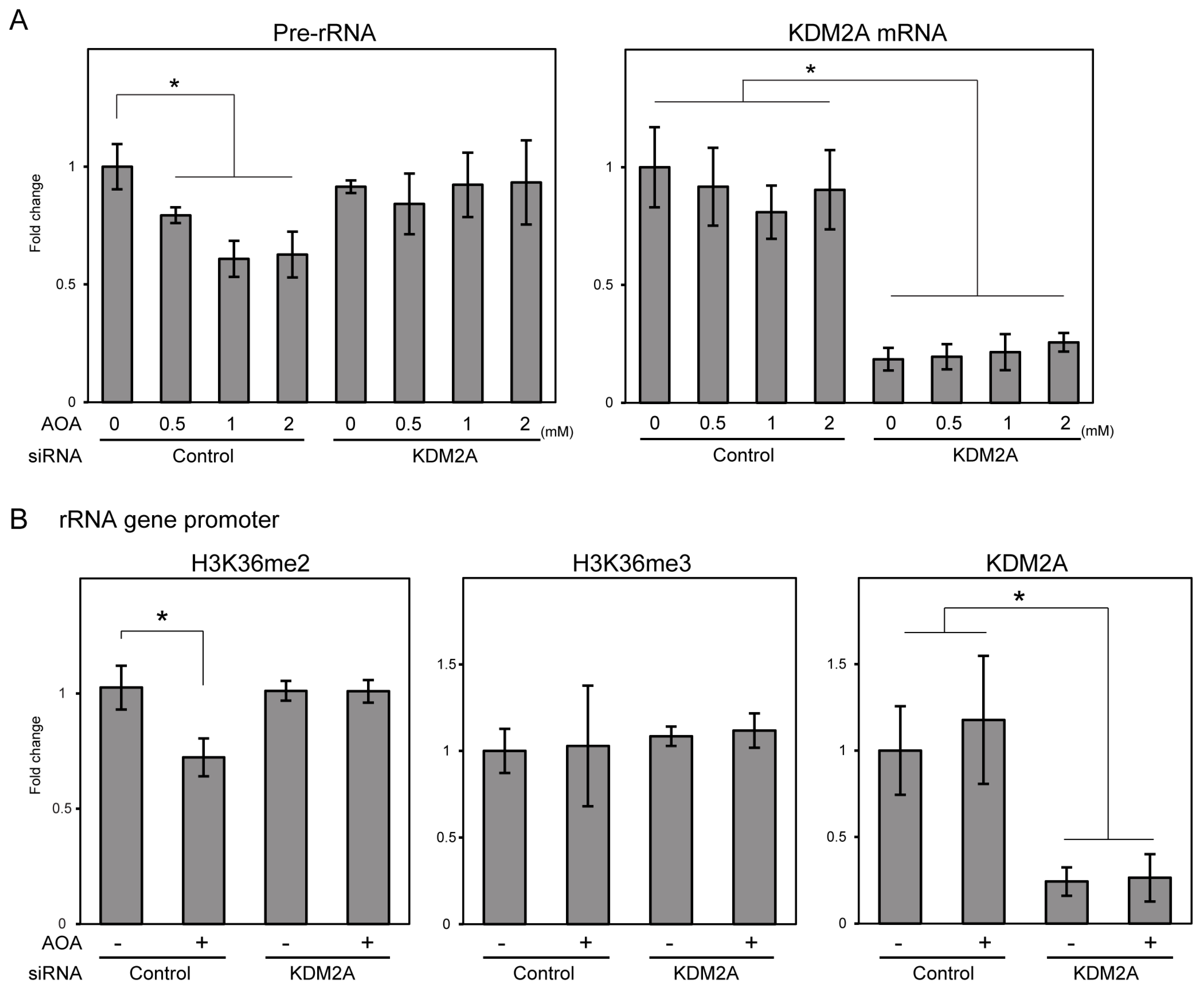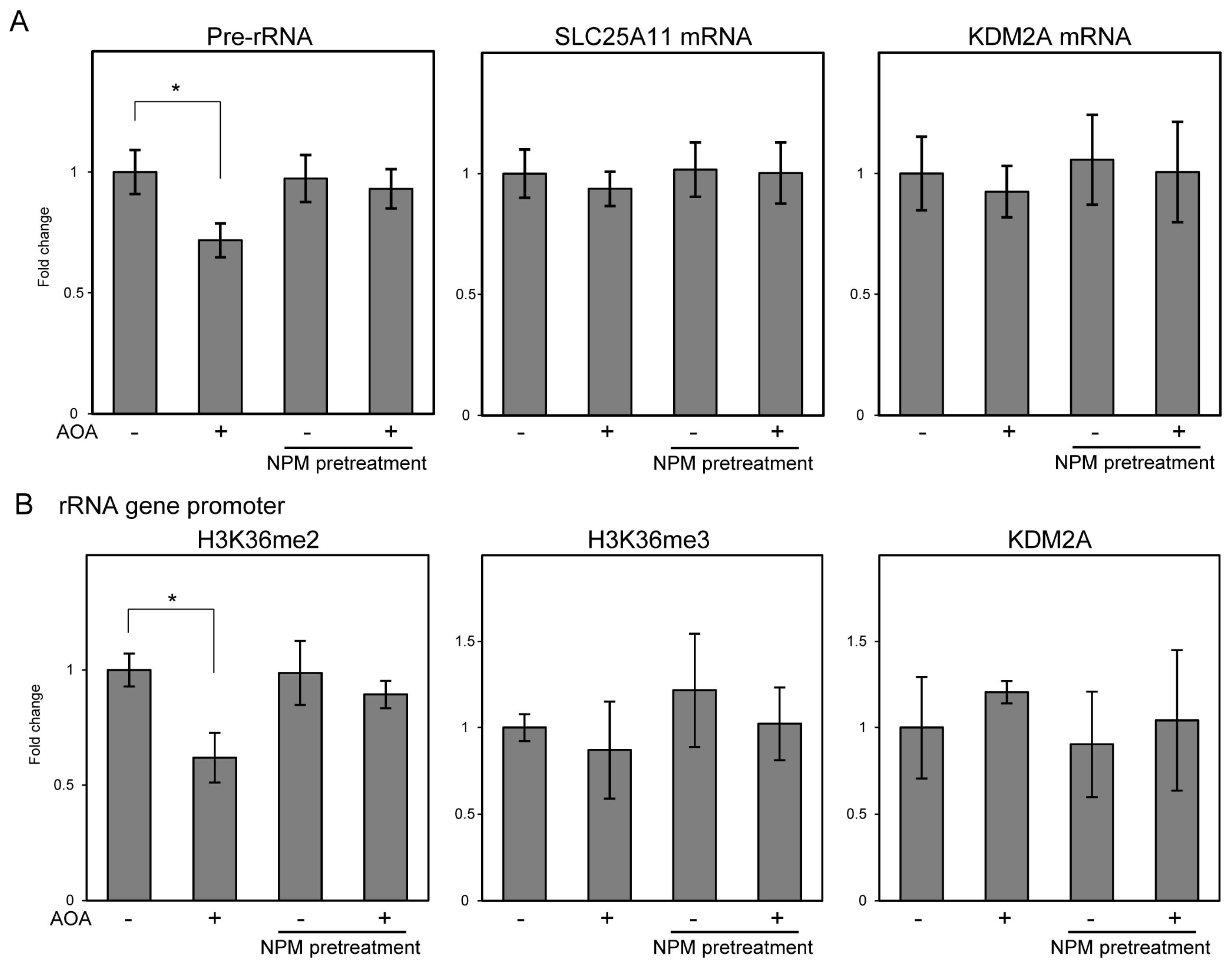 - Malate–aspartate shuttle (MAS) inhibitor AOA induces KDM2A-dependent reduction of rRNA transcription, whereas another MAS inhibitor, NPM, does not.