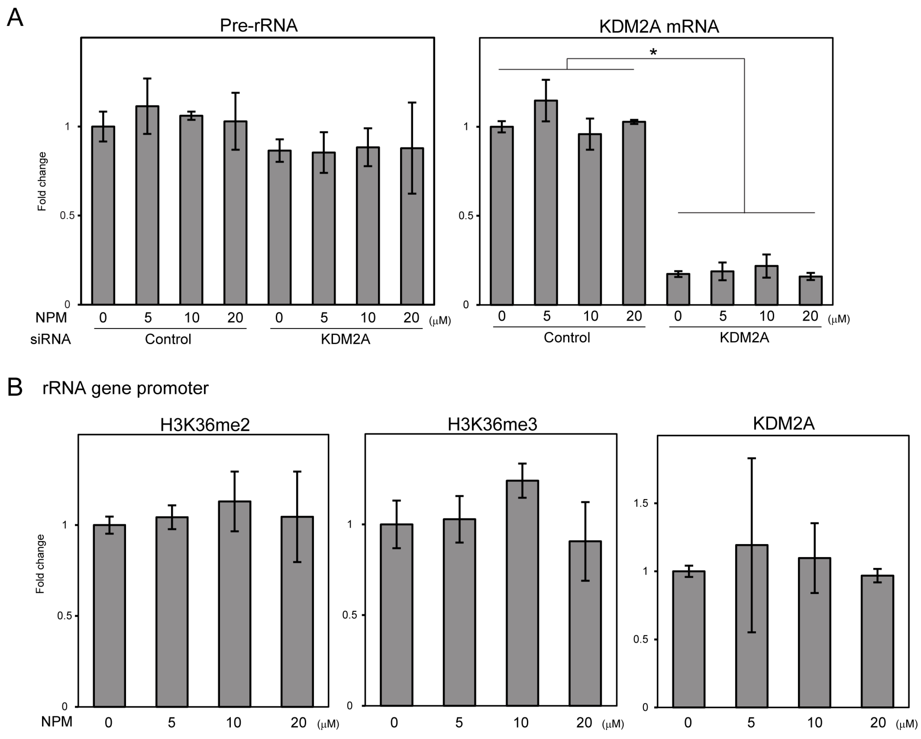 3.3. NPM Treatment Does Not Reduce rRNA Transcription and H3K36me2 Levels in the rRNA Gene Promoter Region