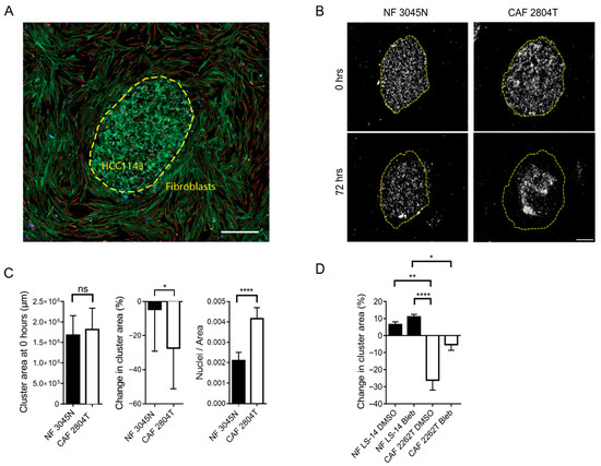 Two-dimensional co-culture of CAFs (2804T) compresses cancer cell clusters. (A) Representative image of 2D co-culture of a cluster of HCC1143 with surrounding fibroblasts, as indicated (yellow dashed line), showing F-actin (green), pan-cytokeratin (blue), and vimentin (red). Scale bar: 500 µm. (B) Representative cancer cell clusters in 2D co-culture with normal fibroblasts (NF) (top) or CAFs (lower panel) at 0 (left) and 72 h (right panel), showing pan-cytokeratin positive cancer cells (white), with the cluster boundary at 0 h indicated by a yellow dashed line. Scale bar: 500 µm, as quantified in (C), showing the change in cluster area (%) during the experiment, the initial area and nuclei density of the clusters, and the cluster area at 0 h. The nuclei density in the clusters and cluster area at 0 h show the mean +/− SEM of three independent biological repeats, with CAF n ≥ 12 2D samples analysed per condition. Change in cluster area and cluster area at 0 h were analysed using a Mann–Whitney test, and nuclei/area were analysed using an unpaired t-test. (D) changes in cancer cluster area in co-culture with NF or CAFs, upon treatment with Blebbistatin (Bleb) or DMSO control. * = p < 0.05, ** = p < 0.01, **** = p < 0.0001, ns = not significant.