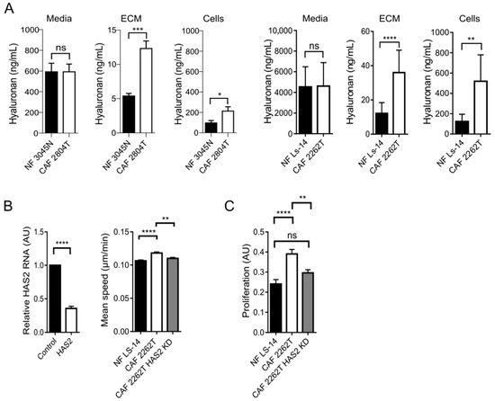 We then aimed to understand why CAFs showed a more heterogeneous distribution in the 3D spheroids. Hyaluronan is one of the most abundant components of the ECM, and it has previously been found to regulate many aspects of cancer [15,16,17]. Therefore, we hypothesized that an increased production of hyaluronan in CAFs could promote the spread of cells. We quantified and compared the levels of soluble, intracellular, and extracellularly deposited hyaluronan produced by CAF and NF. We observed that while the level of soluble hyaluronan in the media did not differ between NFs or CAFs, the levels of intracellular hyaluronan and insoluble hyaluronan deposited into the extracellular matrix were significantly increased in CAFs (Figure 4A). The increased deposition of hyaluronan into the ECM was also visible in the 2D co-culture model (Supplementary Figure S9). Hyaluronan synthase 2 (HAS2) is responsible for most of the production of hyaluronan [29], and it is likely the most prominent HAS in fibroblasts [17,30]. Furthermore, the mRNA levels of HAS2 are significantly higher in TNBC cell lines than in cell lines from less aggressive ER+ breast cancer [31]. To understand the functional role of hyaluronan in TNBC, we therefore knocked down HAS2 and analysed the effect on the CAFs and the TNBC cancer cells. We observed that HAS2 knockdown reduced the migration speed of CAFs to that of normal fibroblasts (Figure 2B and Figure 4B). The level of hyaluronan that the CAFs deposited into the extracellular matrix was further reduced upon loss of HAS2 (Supplementary Figure S10), and this matrix became less coherent (Supplementary Figure S11). We observed no effect on the proliferation of cancer cells on the hyaluronan-deficient matrix (Supplementary Figure S12). However, matrix induced a less spread, and more elongated shape of the cancer cells (Supplementary Figure S13). In 3D co-culture, CAFs stimulated the proliferation of cancer cells, and this effect was lost upon HAS2 knockdown (Figure 4B). Taken together, these findings suggest that hyaluronan produced by TNBC CAFs regulates TNBC cancer cells and that it might have a key role in the maintenance of TNBC.