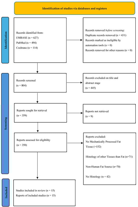 A total of 1235 records were retrieved from database searches. After eliminating 431 duplicates, 804 articles remained for title and abstract screening. Of these, 359 full-text articles were reviewed for eligibility, leading to the exclusion of 344 studies. Ultimately, 15 studies met the inclusion criteria, all of which investigated histological and immunohistochemical assessments of mechanically processed human adipose tissue. A PRISMA flow diagram illustrating the study selection process is provided in Figure 1, and the concrete 15 included studies in Table 2. Their mechanical processing techniques are explained in Table 3.