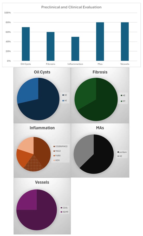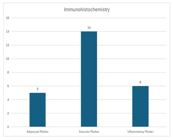 Immunohistochemistry was conducted in 11 studies (73%). Vascular markers were the most frequently assessed, with CD31 used in 7 studies (47%) and CD34 in 5 studies (33%). Perilipin, used to detect mature adipocytes, was applied in 5 studies (33%). Other markers included α-SMA (used in 4 studies), CD90 (3 studies), CD146 (2 studies), and PCNA (2 studies), which were employed to identify proliferating cells, pericytes, and stromal components. Inflammatory markers were analyzed in 5 studies (33%), including F4/80 (4 studies), CD206 (2 studies), and MAC2 (2 studies). A visual summary of immunohistochemical markers used is presented in Figure 2.