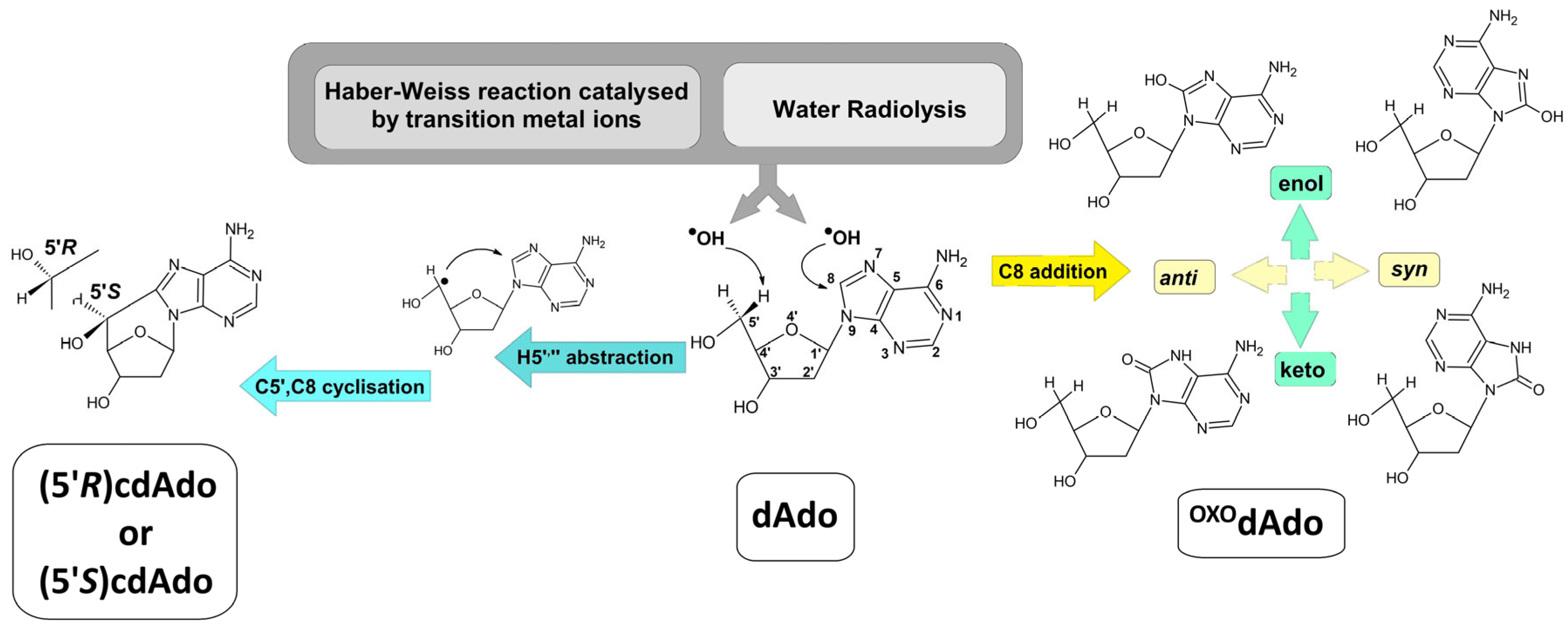 - Karwowski, B.T.; Grand, A.; Cadet, J. 5′,8-Cyclo-2′-Deoxyadenosine (CdA) Formation by γ-Radiation. Theoretical Quantum Mechanics Study. Acta Biochim. Pol. 2009, 56, 655–662. [Google Scholar] [CrossRef]