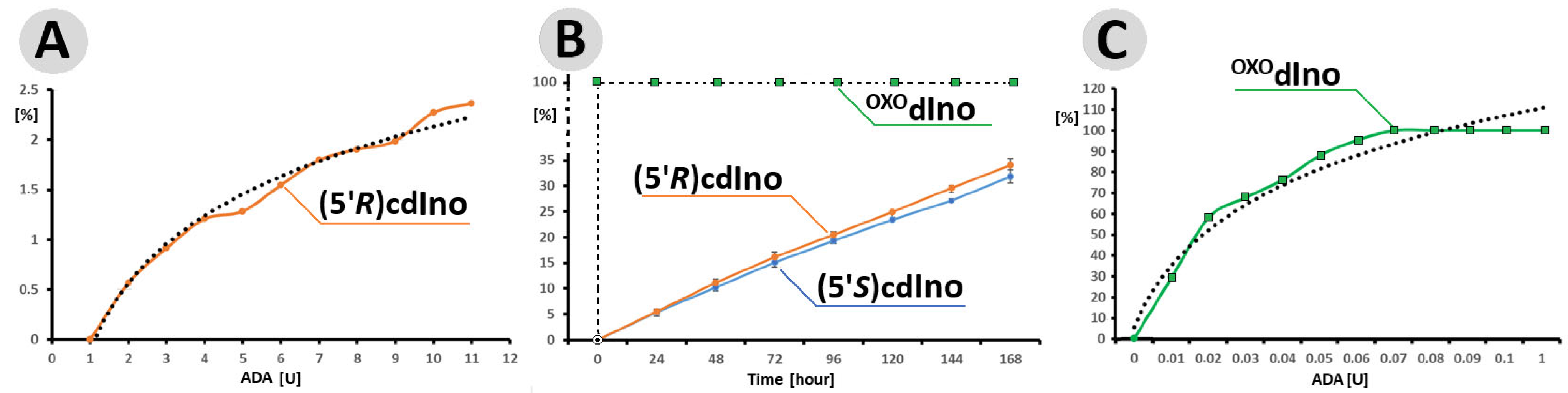 3.1. PR-HPLC Studies of (5′R/S)cdA and OXOdAdo Conversion to (5′R/S)cdIno and OXOdIno by Adenine Deaminase