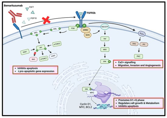 Bemarituzumab inhibits FGFR2b activation by blocking the receptor from binding FGF7/FGF10, preventing receptor dimerisation and tyrosine autophosphorylation (Figure 1) [5,16]. Without this blockade, phosphorylated FGFR2b recruits GRB2–SOS, switches RAS-GDP to RAS-GTP, and drives the RAF → MEK → ERK cascade; nuclear ERK with MYC up-regulates Cyclin D1, MYC, and BCL2, pushing G1 → S transition and suppressing apoptosis [17,18]. Parallel phosphotyrosines activate PI3K, generating PIP3, which brings in PDK1 and mTORC2 to activate AKT; AKT phosphorylates BAD, inactivates FOXO, and stimulates mTORC1, jointly blocking pro-apoptotic transcription while boosting anabolic metabolism [19,20]. A third branch phosphorylates PLCγ, which cleaves PIP2 to IP3 and DAG; IP3 mobilizes Ca2+ and DAG activates PKC, and the resulting Ca2+/PKC signals reinforce MAPK and AKT outputs to enhance migration, invasion, and angiogenesis [19,21]. FGFR2b over-expression or amplification—common in gastric cancer—amplifies these pathways and predicts poorer survival [10]. By sealing FGFR2b at the membrane, bemarituzumab simultaneously silences GRB2–SOS–RAS, PI3K–AKT, and PLCγ–PKC signaling, suppressing proliferation, inducing apoptosis, and blunting the invasive, pro-angiogenic phenotype of FGFR2b-addicted tumors [6,16].