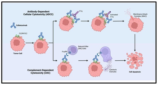 Zolbetuximab, is a first-in-class chimeric IgG1 monoclonal antibody developed to bind CLDN18.2, that exploits this tumor-restricted expression pattern to selectively kill CLDN18.2-positive tumor cells (Figure 2). Upon binding, zolbetuximab mediates antitumor activity through two immune effector mechanisms [31,32,33]: