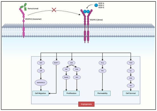 Ramucirumab, a monoclonal antibody that blocks VEGFR2 signaling, is already FDA-approved for advanced gastric cancer, validating VEGFR2 as a therapeutic target. Ramucirumab binds the extracellular domain of VEGFR2, preventing receptor activation and subsequent downstream pro-angiogenic signaling (Figure 3), thereby effectively inhibiting neovascularization and tumor progression.