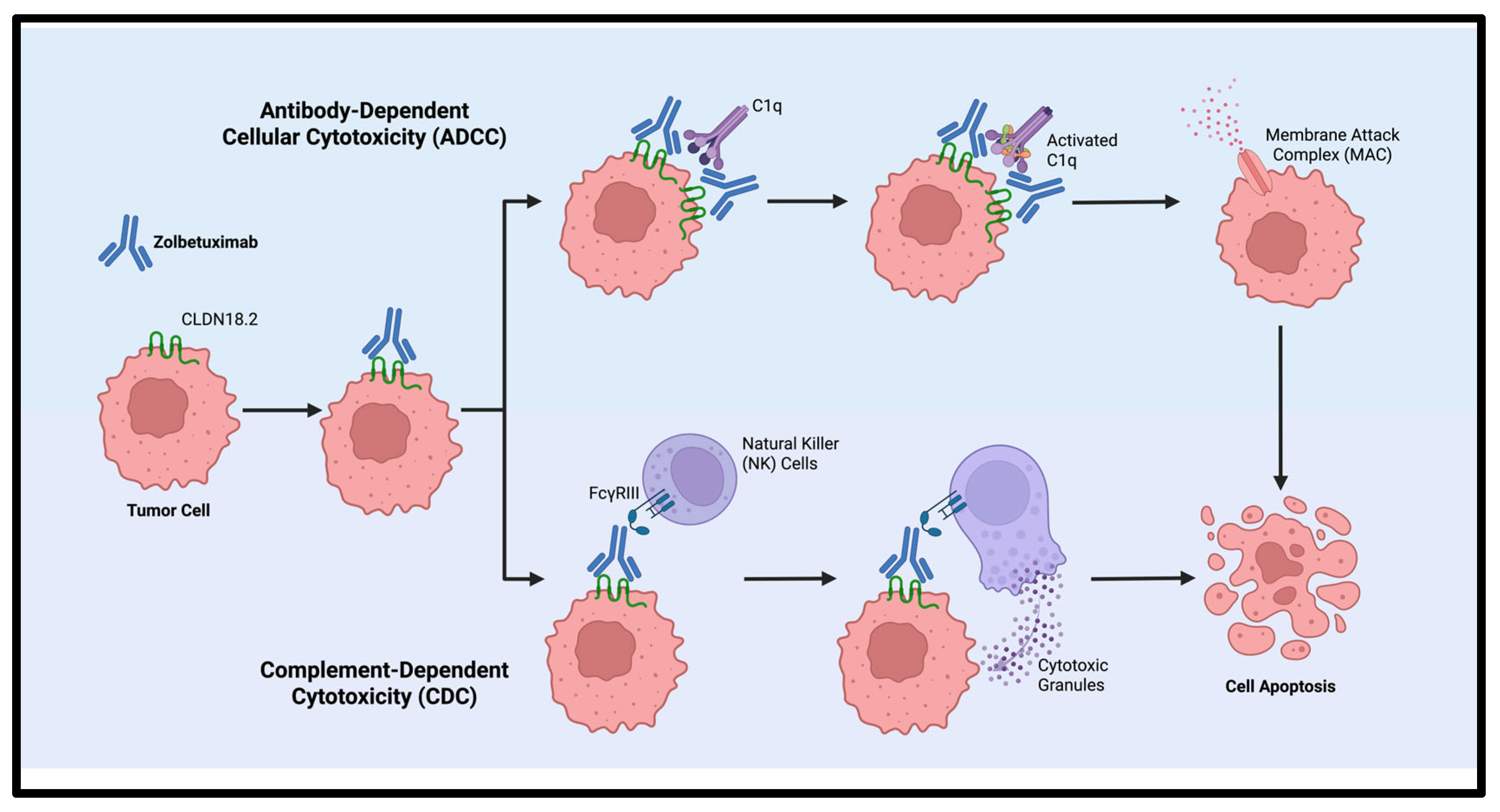 - Antibody-dependent cellular cytotoxicity (ADCC): Zolbetuximab binds to CLDN18.2, and its Fc region engages Fc gamma receptor III (FcγRIII)-expressing effector cells, including natural killer (NK) cells and gamma-delta (γδ) T cells [34,35,36]. This interaction activates immune cells to release cytotoxic granules containing perforin and granzymes, leading to pore formation, caspase activation, and apoptosis of tumor cells.