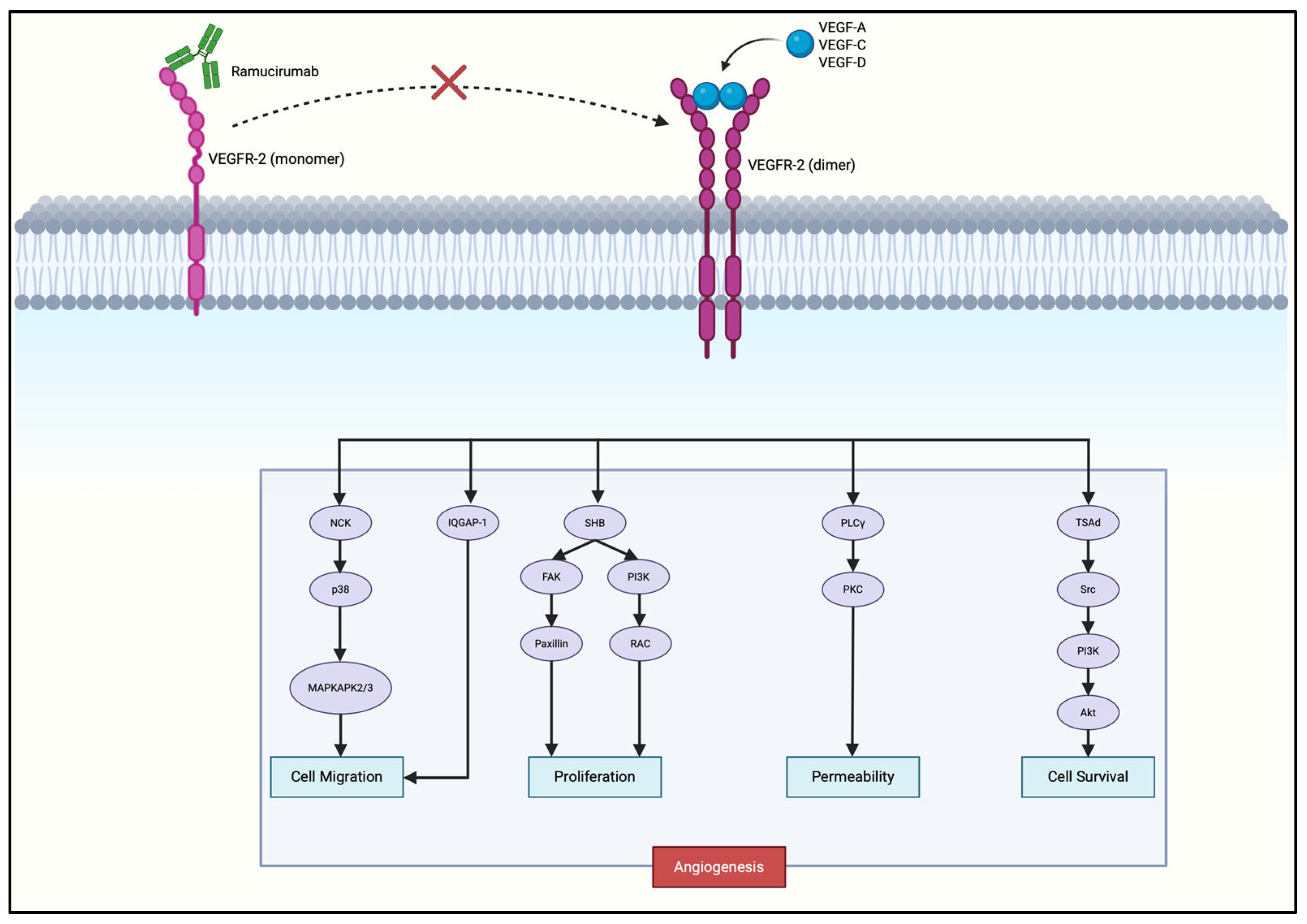 - Spratlin, J.L.; Cohen, R.B.; Eadens, M.; Gore, L.; Camidge, D.R.; Diab, S.; Leong, S.; O’Bryant, C.; Chow, L.Q.M.; Serkova, N.J.; et al. Phase I Pharmacologic and Biologic Study of Ramucirumab (IMC-1121B), a Fully Human Immunoglobulin G1 Monoclonal Antibody Targeting the Vascular Endothelial Growth Factor Receptor-2. J. Clin. Oncol. 2010, 28, 780–787. [Google Scholar] [CrossRef]