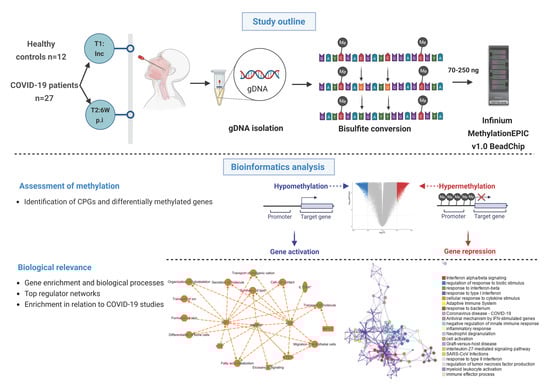 - Corley, M.J.; Pang, A.P.S.; Dody, K.; Mudd, P.A.; Patterson, B.K.; Seethamraju, H.; Bram, Y.; Peluso, M.J.; Torres, L.; Iyer, N.S.; et al. Genome-wide DNA methylation profiling of peripheral blood reveals an epigenetic signature associated with severe COVID-19. J. Leukoc. Biol. 2021, 110, 21–26. [Google Scholar] [CrossRef]
