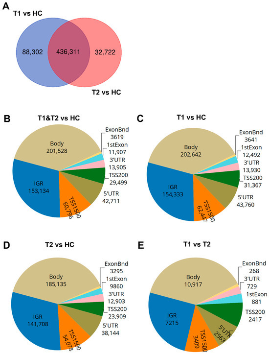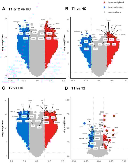 | Patients T2 vs. HC | NXN, FMNL2, ZBTB46, SLC35F3, SHQ1, C14orf166, CPA2, PLCL2, PAPSS2, APOB, MFSD6L, PRDM16 | ELMO1, XBP1, GRIK1, TNFAIP8, LOC101928650, SH3BP5, BACH2, KIF6, PIEZO2, BCAR3, FYCO1, PIP5K1B, |