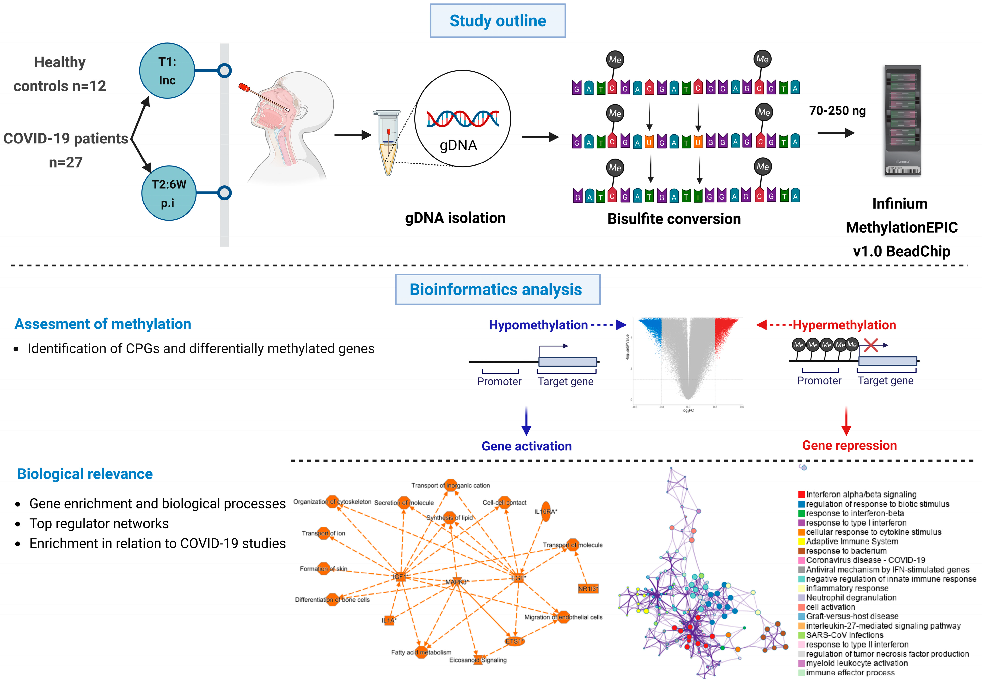 - COVID-19 patients show a unique DNA methylation profile in the upper airway, with over 510,000 differentially methylated CpGs affecting antiviral, interferon, and immune response genes.