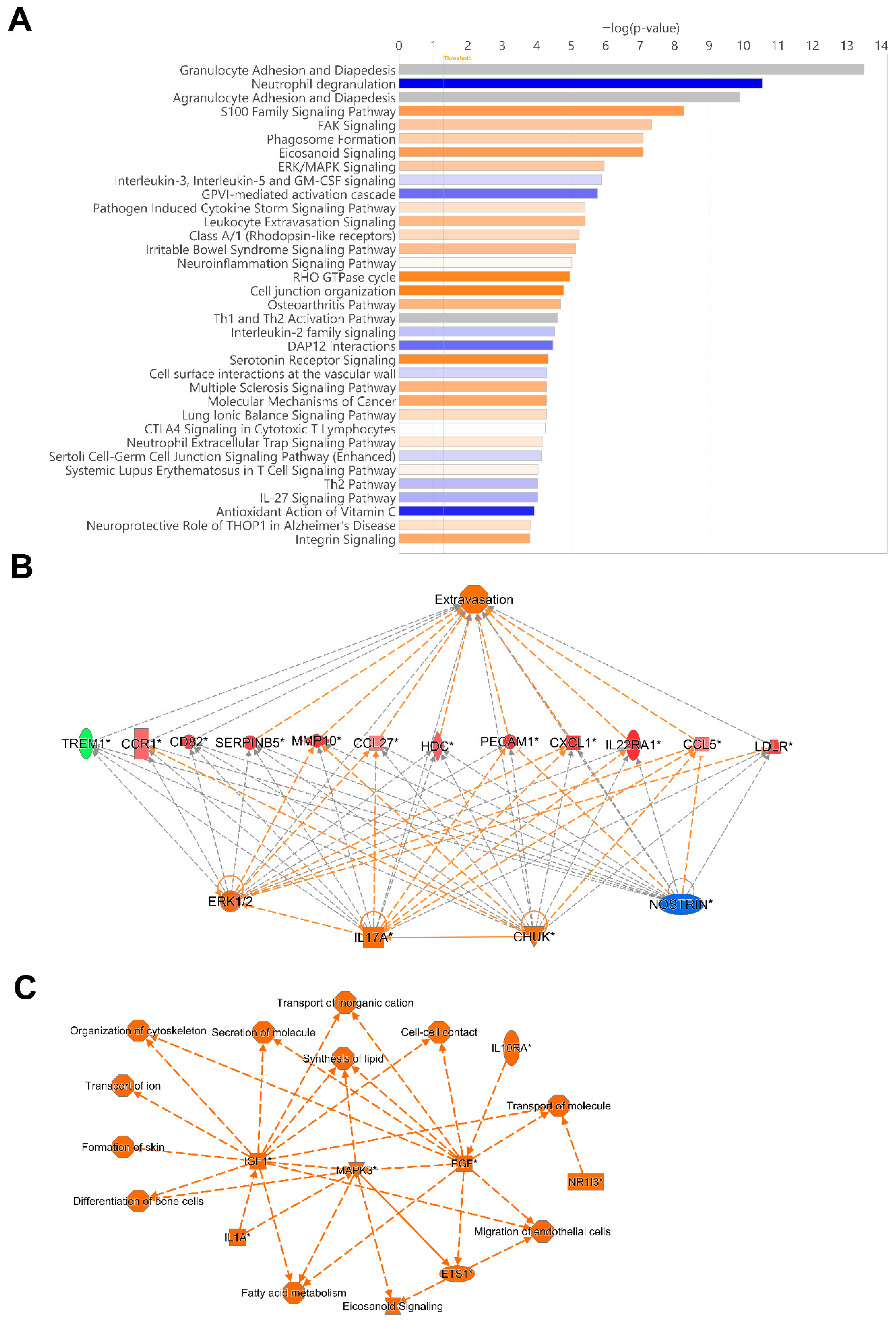 3.7. ERK1/2, IL17A and NOSTRIN Were Identified as Top Regulators, and MAPK3, IGF1, and EGF to Be Involved in Several Biological Processes in COVID-19 Patients