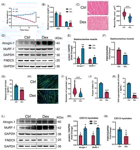 To investigate the role of FNDC5/irisin in glucocorticoid-induced muscle atrophy, we employed Dex, a synthetic glucocorticoid analogue, to establish a well-characterized murine model of muscle wasting. Dex administration caused a marked reduction in body weight over the treatment period (Figure 1A). Consistent with systemic wasting, Dex treatment resulted in significant decreases in gastrocnemius and tibialis anterior muscle weights (Figure 1B) and reduced myofibre cross-sectional area in the gastrocnemius (Figure 1C). Notably, Western blot analysis confirmed elevated expression of atrophy-related ubiquitin ligases Atrogin-1 and MuRF-1 in Dex-treated muscles (Figure 1D,E). These data confirm that we successfully reproduced previously reported models of dexamethasone-induced muscle atrophy [19,20].