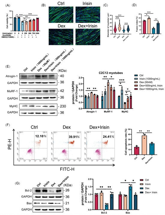 Given the observed downregulation of FNDC5/irisin in the Dex-induced muscle atrophy model, we investigated whether irisin reconstitution could rescue Dex-mediated myopathic phenotypes. In C2C12 myotubes, R-irisin administration dose-dependently reversed Dex-induced reductions in myotube viability (Figure 2A). Similarly, R-irisin treatment effectively prevented Dex-induced myotube atrophy (Figure 2B,C). Furthermore, even at the baseline level, the myotube diameter and fusion index were significantly increased following R-irisin exposure (Figure 2B–D). Western blot analyses revealed that R-irisin administration suppressed Dex-induced upregulation of atrophy markers Atrogin-1 and MuRF-1 (Figure 2E). Crucially, R-irisin robustly restored myosin heavy chain (MyHC) protein levels—a hallmark of myotube formation—in Dex-treated myotubes in a dose-dependent manner (Figure 2E). Strikingly, R-irisin (1 μg/mL) significantly enhanced baseline MyHC expression in control myotubes (Figure 2E), suggesting intrinsic myogenic properties. Furthermore, R-irisin demonstrated potent anti-apoptotic effects, markedly attenuating Dex-induced apoptosis in myotubes (Figure 2F,G). These findings collectively indicate that R-irisin functions as a pro-myogenic factor, promoting myotube hypertrophy while rescuing Dex-mediated atrophy and apoptotic responses.
