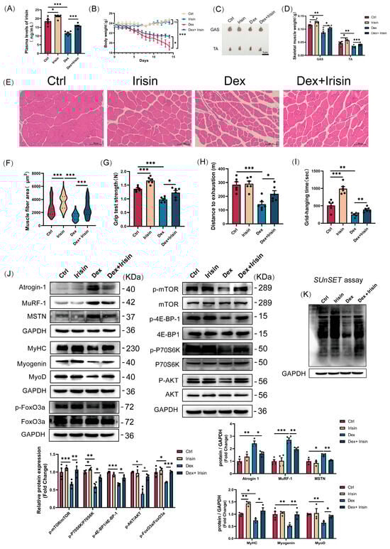 Male C57BL/6J mice (8 weeks old) were housed under controlled conditions (temperature: 22 ± 3 °C; humidity: 40–50%; 12 h light-dark cycle) with ad libitum access to food and water. Animals were randomly assigned to five groups (n = 6 per group) and administered treatments as follows: (i) Control group: vehicle (PEG300 solution, i.p.); (ii) Irisin group: The irisin stock solution was prepared using sterile physiological saline as the solvent at a concentration of 500 μg/mL (2.5 mg/kg, i.p.); (iii) Dex group: The formulation of the dexamethasone stock solution comprises PEG300 at a concentration of 2.5 mg/mL (25 mg/kg, i.p.); (iv) Dex + Irisin group: dexamethasone (25 mg/kg, i.p.) + irisin (2.5 mg/kg, i.p.); (v) Dex + Irisin + EX-527 (SIRT1 inhibiting drug) group: dexamethasone (25 mg/kg, i.p.) + Irisin (2.5 mg/kg, i.p.) + EX-527 (10 mg/kg, i.p.). Based on previous studies [16], Irisin was administered three times weekly, while dexamethasone and EX-527 were administered daily, over a total duration of 14 consecutive days. Body weight was recorded daily. Samples of blood, gastrocnemius (GAS), and tibialis anterior (TA) muscles were collected at 24 h following the last injection. Upon collection, the muscle tissues were immediately weighed and photographed, followed by fixation in 4% paraformaldehyde or flash-freezing in liquid nitrogen for subsequent analysis. All experimental manipulations were carried out in compliance with protocols authorized by the Animal Care Committee of Shanxi Agricultural University (SXAU-EAW2024M.ID.011005320).