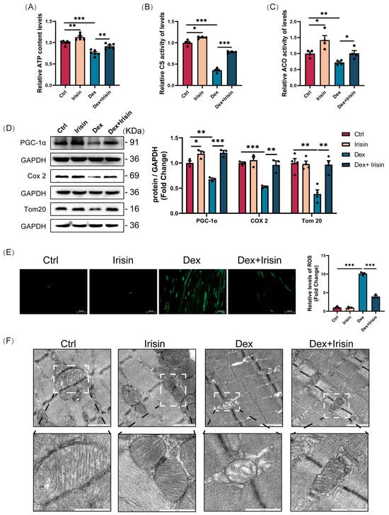 R-irisin reverses Dex-induced mitochondrial dysfunction in mouse skeletal muscle. A murine model of muscle atrophy was induced using a relatively high dose of dexamethasone (25 mg/kg bw, i. p. 14 days) and treated with irisin (2.5 mg/kg bw, i. p. three times a week). The results were as follows: (A) Mitochondrial ATP generation capacity in gastrocnemius (Gast) (n = 6 per group). (B,C) Activities of citrate synthase (CS) and aconitase (ACO) in Gast mitochondria (n = 4 per group). (D) Western blot analysis of mitochondrial biogenesis/function markers PGC-1α, Tom20, and Cox2 in Gast mitochondria (n = 3–4 per group). (E) Myotube reactive oxygen species (ROS) levels quantified by fluorescence microscopy (scale bar = 100 μm). (F) Transmission electron microscopy (TEM) images of Gast mitochondrial morphology (scale bars: 1000 nm/600 nm). All protein band densities have been normalized to the appropriate GAPDH loading control. Results are mean ± SEM; The symbol “•” denotes biological replicates; * p < 0.05, ** p < 0.01, *** p < 0.001.