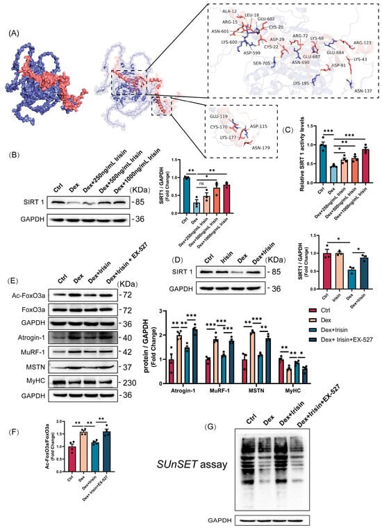 SIRT1 plays a pivotal role in regulating skeletal muscle remodelling. To validate whether irisin directly interacts with SIRT1, we performed virtual docking analysis. The binding affinity of the irisin-SIRT1 complex was calculated to be −12.7 kcal/mol, indicating a strong binding interaction. The detailed interaction interfaces, including key residues involved in the binding, are illustrated in the figure (Figure 5A). Furthermore, treatment with 50 μM dexamethasone significantly reduced SIRT1 levels in C2C12 myotubes (Figure 5B). Strikingly, R-irisin rescued SIRT1 expression in a concentration-dependent manner (Figure 5B). Fluorometric assays further confirmed that R-irisin dose-dependently restored SIRT1 deacetylase activity (Figure 5C). In vivo, R-irisin administration reversed Dex-induced SIRT1 suppression in muscle tissues (Figure 5D). Mechanistically, Dex-mediated SIRT1 inhibition increased FoxO3a acetylation, driving upregulation of atrophy-related proteins atrogin-1, MuRF-1, and MSTN, while suppressing myogenic regulatory factor MyHC. R-irisin restored SIRT1 deacetylase activity, thereby suppressing FoxO3a hyperacetylation and downregulating atrogin-1/MuRF-1/MSTN expression (Figure 5E,F). Notably, co-treatment with the SIRT1-specific inhibitor EX-527 abolished R-irisin’s anti-atrophic effects (Figure 5E,F). Furthermore, R-irisin’s ability to rescue Dex-induced deficits in protein synthesis—assessed via puromycin incorporation assays—was dependent on SIRT1 activity (Figure 5G). These findings establish that R-irisin exerts its protective effects through SIRT1-mediated deacetylation pathways, coordinately regulating proteostasis and myogenesis.