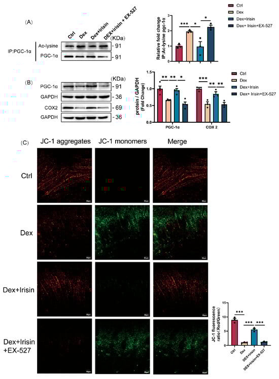 PGC-1α, a key substrate of SIRT1 deacetylation and its biologically active form 13, was significantly hyperacetylated in Dex-treated C2C12 myotubes. Immunoprecipitation (IP) revealed that R-irisin treatment reversed Dex-induced elevation of acetylated PGC-1α (Figure 6A). Consistent with these findings, co-administration of the SIRT1 inhibitor EX-527 abolished R-irisin’s effects on both total and acetylated PGC-1α levels (Figure 6A). Western blot analyses further demonstrated that R-irisin-mediated restoration of mitochondrial biogenesis markers and function was blocked by EX-527 (Figure 6B). Mitochondrial membrane potential staining showed that Dex induced a collapse in membrane potential, which was rescued by R-irisin but reversed by EX-527 co-treatment (Figure 6C). Collectively, these results establish that R-irisin alleviates Dex-induced atrophy and mitochondrial dysfunction by restoring SIRT1-dependent deacetylation of FoxO3a and PGC-1α, thereby reactivating their pro-myogenic and bioenergetic functions.