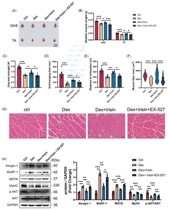 R-irisin attenuates Dex-induced muscle atrophy in mice via SIRT1 activation. To evaluate the interplay between irisin and SIRT1 signaling in Dex-induced muscle atrophy, we implemented a combined treatment regimen: irisin was co-administered with the SIRT1 inhibitor EX-527 (10 mg/kg body weight, i. p. 14 days). The results were as follows: (A,B) Gastrocnemius (Gast) and tibialis anterior (TA) muscle morphology and mass analysis (n = 6 per group). (C–E) Functional assessment of muscle grip strength, grid hanging capacity, and treadmill exhaustive distance in mice (n = 6 per group). (F,G) Histological analysis of Gast myofibre cross-sectional area (CSA) via H&E staining (scale bars = 100 μm; n = 6 per group). (H) Western blot quantification of atrophy markers (atrogin-1, MuRF-1, MSTN) and myogenic regulators (MyHC, p-AKT/AKT) (n = 3–4 per group). Protein band densities were normalized to GAPDH. The data are presented as mean ± SEM; The symbol “•” denotes biological replicates; * p < 0.05, ** p < 0.01, *** p < 0.001.