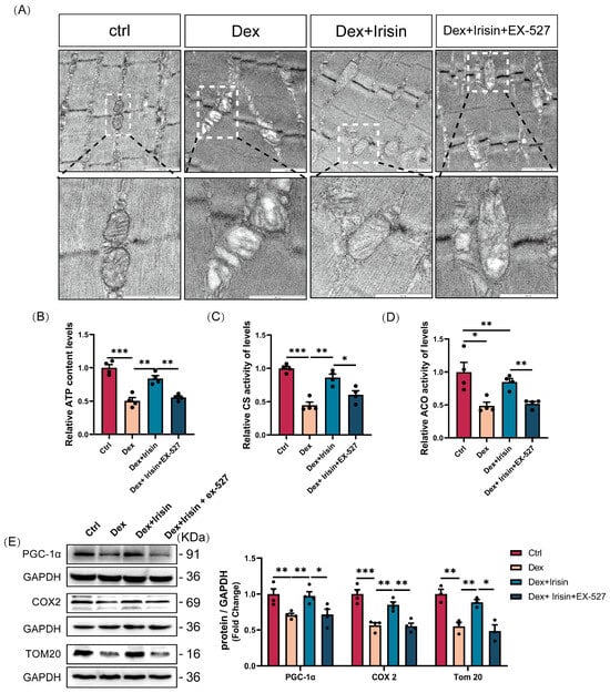 R-irisin attenuates Dex-induced muscle mitochondrial dysfunction in mice via SIRT1 activation. To evaluate the interplay between irisin and SIRT1 signaling in Dex-induced muscle atrophy, we implemented a combined treatment regimen: irisin was co-administered with the SIRT1 inhibitor EX-527 (10 mg/kg body weight, i. p. 14 days). (A) Transmission electron microscopy (TEM) analysis of mitochondrial morphology in gastrocnemius (Gast) (bars = 1000 nm/600 nm; n = 3 per group). (B) ATP generation capacity in Gast mitochondria (n = 4 per group). (C,D) Enzymatic activities of citrate synthase (CS) and aconitase (ACO) in Gast mitochondria (n = 4 per group). (E) Western blot quantification of mitochondrial biogenesis/function markers PGC-1α, Tom20, and COX2 in Gast (n = 3–4 per group). Protein band densities were normalized to GAPDH. The data are presented as mean ± SEM; The symbol “•” denotes biological replicates; * p < 0.05, ** p < 0.01, *** p < 0.001.