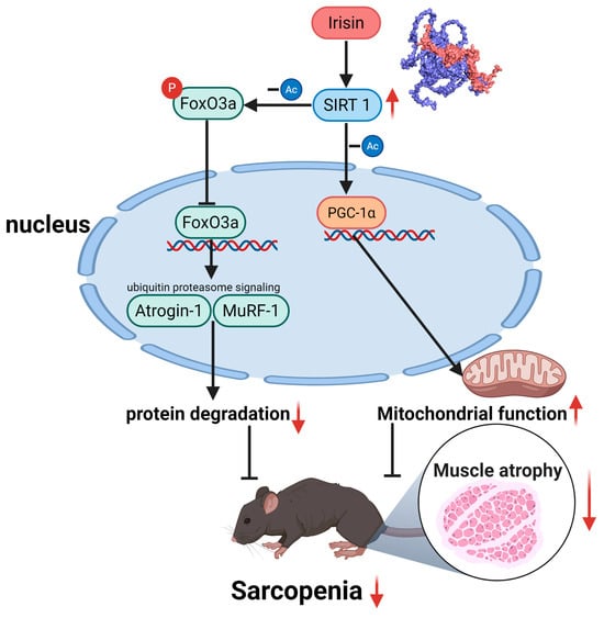 Beyond its role in proteostasis, irisin exerts profound effects on mitochondrial biogenesis and function, which are critical in glucocorticoid-induced muscle atrophy. PGC-1α, a master regulator of mitochondrial biogenesis and cellular energy metabolism, drives mitochondrial biogenesis by stimulating transcription factors nuclear respiratory factor 1 and 2 (NRF-1 and NRF-2), thereby increasing mitochondrial enzyme transcription [34]. During muscle atrophy, mitochondrial degradation reduces mitochondrial mass and quantity, governed by mitophagy and mitochondrial fusion/fission dynamics [35]. These mitochondrial quality control systems are essential for maintaining skeletal muscle mass by identifying and correcting mitochondrial dysfunction. Mitochondrial dysfunction triggers catabolic pathways that feedback to the nucleus to promote expression of muscle atrophy-related genes [36]. Here, irisin enhances PGC-1α expression and reduces its acetylation status via SIRT1 activation, augmenting its transcriptional activity. This results in significant improvements in mitochondrial DNA synthesis, ATP production, and enzymatic activities of citrate synthase and aconitase, collectively restoring mitochondrial morphology and function. Normalization of mitochondrial parameters correlates with functional recovery, evidenced by improved grip strength and treadmill endurance in treated mice. This mitochondrial remodelling effect positions irisin as a central regulator of systemic energy homeostasis. By simultaneously enhancing mitochondrial biogenesis and protein synthesis, irisin creates a synergistic anabolic environment. This dual mechanism is particularly relevant in aged populations, where mitochondrial dysfunction serves as a primary driver of sarcopenia progression.