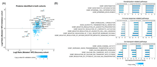 Given the heterogeneous biological backgrounds of the differentially expressed proteins, we conducted a Gene Set Enrichment Analysis (GSEA) to further investigate the impact of CTNNB1 mutations on the tumor proteome. To this end, we selected 1444 pathways from the GO and Kegg pathway repositories, which included at least one of our 30 proteins of interest. The Net Enrichment (NE) Score of these pathways was compared across the proteomic data of the discovery and validation sample sets, as well as the transcriptomic data of the validation cohort. We selected pathways that showed an NE score within the highest or lowest 15% across the three datasets. After filtering, 24 pathways were found to be consistently dysregulated (Figure 1B). These could be grossly classified into pathways associated with keratinization or squamous cell differentiation, immune microenvironment shaping, and cellular calcium homeostasis regulation.