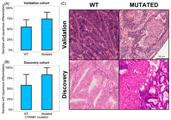 Samples with squamous differentiation in discovery cohort (A) and validation cohort (B). (C) Representative microphotographs demonstrating squamous differentiation in mutated cases but not in WT samples.