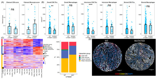 (A) Results from the CIBERSORT scores in the validation cohort. (B) Multiplex Immunofluorescence analysis in a cohort of low-grade early-stage carcinomas. (C) Heatmap and bar plot representing spatial interaction analysis results according to MIF results. (D) Representative photographs of CTNNNB1 wild-type and mutated tumors. ns: not significant. *: p < 0.05, **: p < 0.01, ***: p < 0.001.