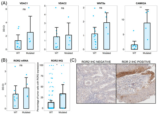 (A) Transcript expression analysis between WT and mutated tumors. (B) ROR2 mRNA and immunohistochemical analysis between WT and mutated tumors. (C) Representative microphotographs representing ROR2 negative and positive tumors. ns: not significant. *: p < 0.05, **: p < 0.01.