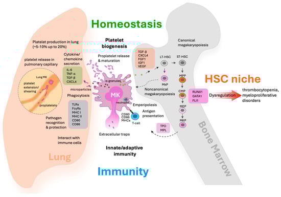 Lung MKs, strategically positioned within pulmonary capillary beds, further highlight this bridging role. They rapidly replenish platelets in circulation under stress conditions while also serving as frontline immune sentinels. Their heightened immune gene expression and ability to process and present antigens uniquely equip them to detect pathogens in the lung vasculature, coordinate local immune surveillance, and contribute to lung tissue protection. By contrast, bone marrow MKs focus more on sustaining the HSC niche and ensuring systemic hematopoietic stability [39,40,41,44,45,48].