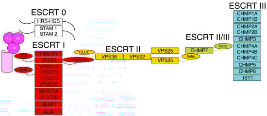 The ESCRT factors are regrouped into four types, from 0 to IV. The type 0 and type I ESCRT factors define, in principle, the site of action of the machinery (Figure 1). ESCRTs type II are a bridge to the recruitment of ESCRTs type III or late ESCRT factors. The latter are needed for the action of the machinery; namely, they are directly involved in membrane remodeling and scission. In human cells, the main components of the ESCRT machinery are as follows: type 0—HRS-HGS, STAM1 and STAM2. ESCRTs; type I—TSG101, VPS28, VPS37, in its four isoforms VPS37 A to D, MVB12 A and B, UBAP1 and Alix; type II—VPS25, VPS36 and VPS22; and ESCRTs type III—CHMP1A and B, CHMP2A and B, CHMP3, CHMP4A to C, CHMP5, CHMP6, CHMP7, and IST1 (or CHMP8). Physical and in silico prediction studies have defined a rod shaped hetero-tetrameric structure for ESCRTs type I, and a Y-shaped structure for ESCRTs type II [7,8,9]. Single ESCRT III factors are small proteins containing five to six alpha helices that form polymers and have a dynamic structural behavior. Indeed, they are detected as soluble factors, or as filaments [10,11] and, on membranes, they can typically spiralize [12].