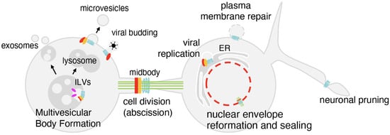 Beyond multivesicular body formation and abscission, the ESCRT machinery is involved in many other functions (Figure 2). It contributes, for example, to neuronal pruning, impacting organismal development [71].