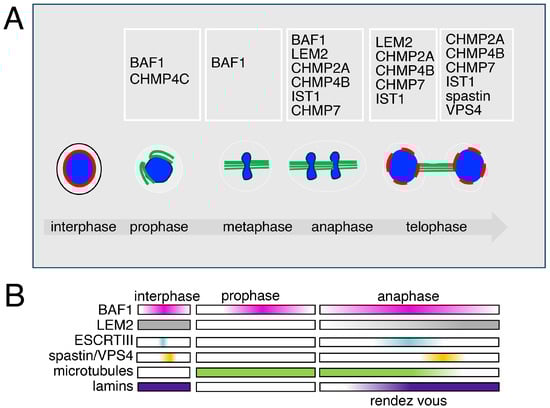 In the final stages of mitosis, the reverse process happens, i.e., nuclear envelope reassembly. During anaphase and telophase, while the chromatids slide along microtubules with the help of kinetochore motors to opposite poles, the nuclear envelope reassembles in the daughter nuclei. During this process, the multiple factors associated and composing the nuclear envelope wrap the decondensing chromatids. These include lamin A/C and lamin-associated proteins such as LAP2α, LAP2 β, LEM2 and emerin, and the chromatin-binding factor BAF1, lamin B, lamin B receptor and the components of the nuclear pore complexes [107,128,129,130,131,132,133,134]. How the recruitment of these factors and the completion of nuclear envelope assembly are intermingled with the ESCRT machinery will be discussed in the successive section.