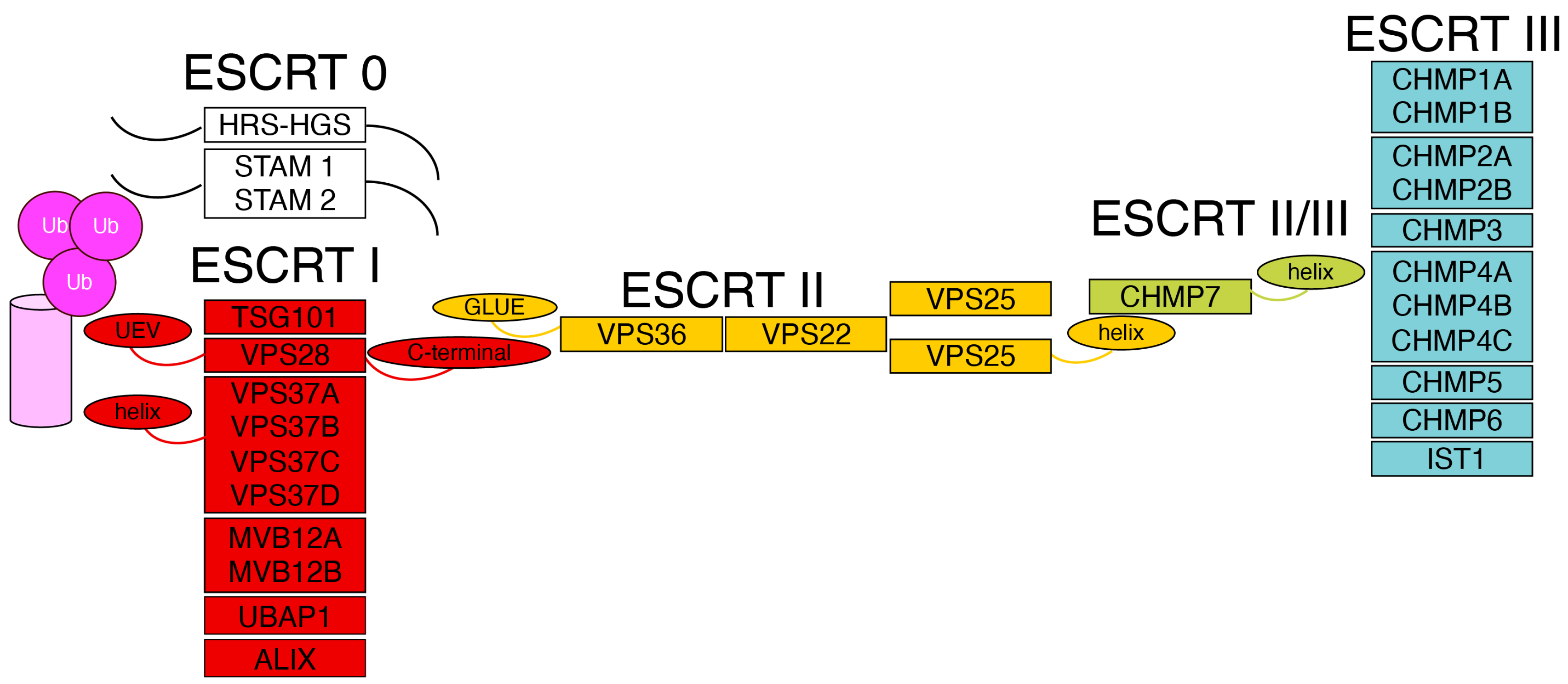 | ESCRT 0 | Vps27 [22] | Vps27 (Sst4) [23] | Hrs [24] | HRS (HGS) [25] |