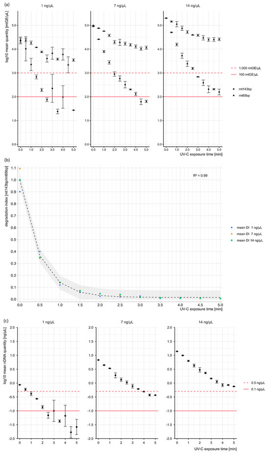 | UV-C Exposure [Min] | mt143bp [mtGE/µL] | mt69bp [mtGE/µL] | nuRNU [ng/µL] | ||||||
