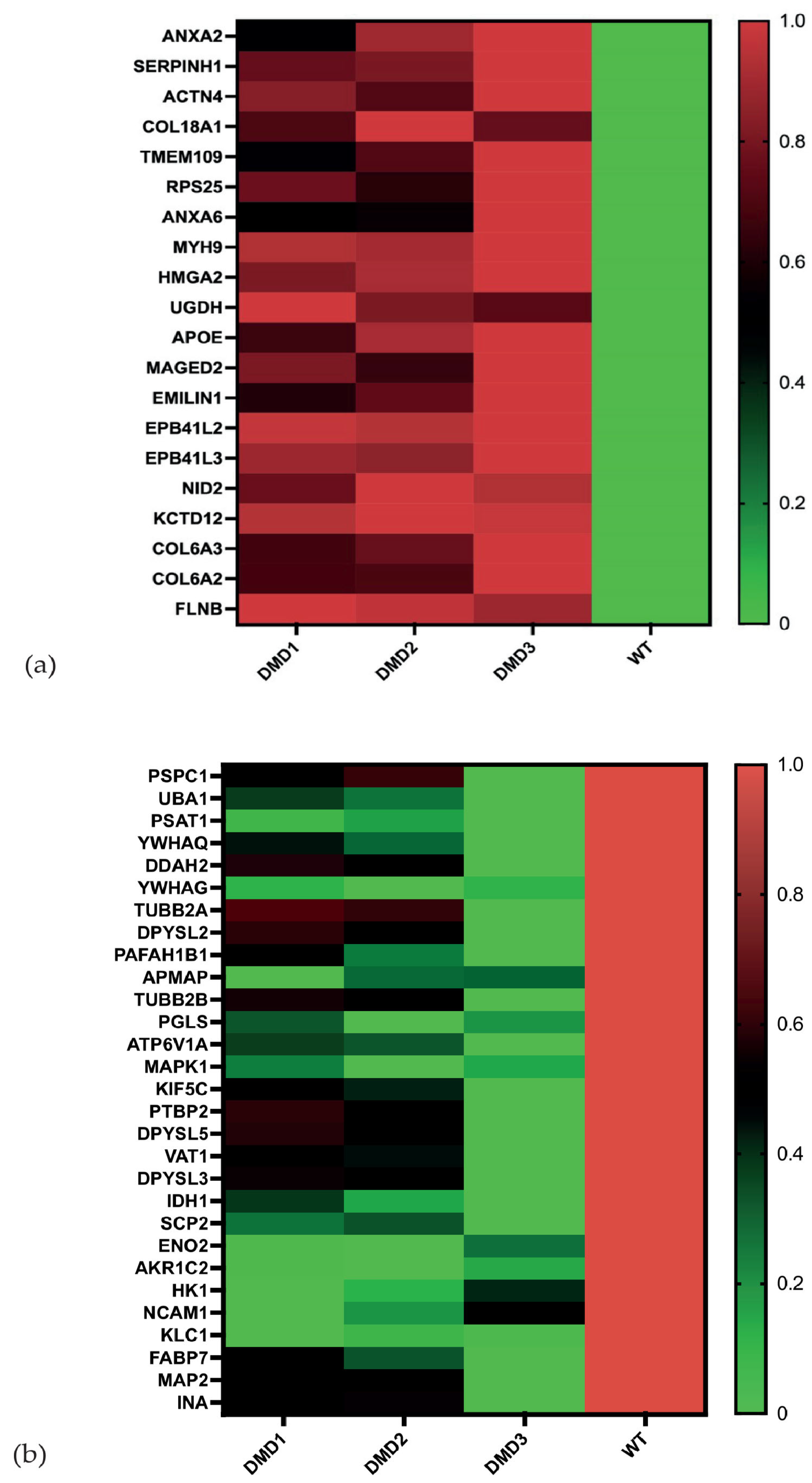 - Capitanio, D.; Moriggi, M.; Torretta, E.; Barbacini, P.; De Palma, S.; Viganò, A.; Lochmüller, H.; Muntoni, F.; Ferlini, A.; Mora, M.; et al. Comparative Proteomic Analyses of Duchenne Muscular Dystrophy and Becker Muscular Dystrophy Muscles: Changes Contributing to Preserve Muscle Function in Becker Muscular Dystrophy Patients. J. Cachexia Sarcopenia Muscle 2020, 11, 547–563. [Google Scholar] [CrossRef]