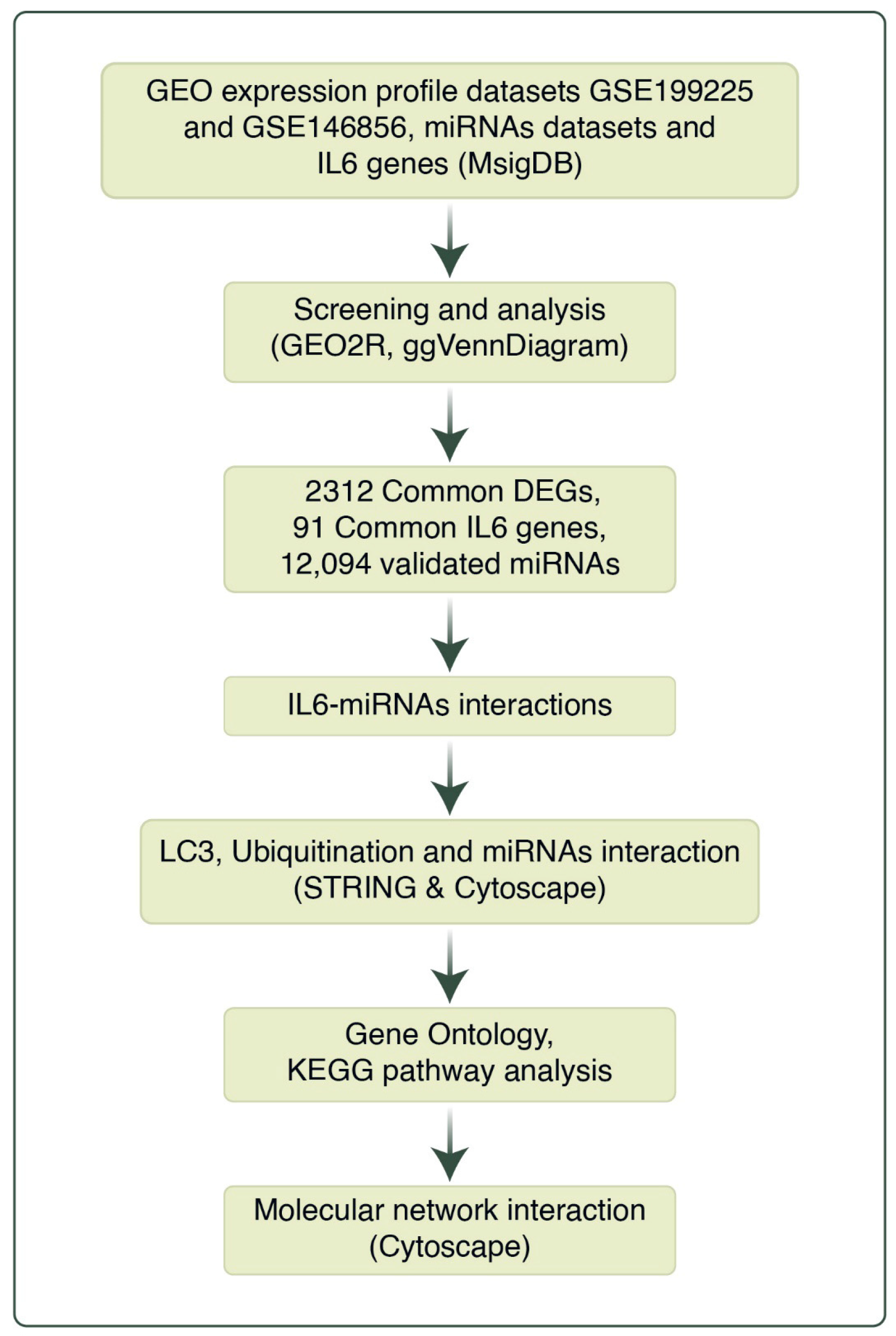 IL6 signaling-related genes were extracted from the Molecular Signature Database (MSigDB) according to the Human collection Biocarta, Apoptosis, and IL6 pathway gene sets category [25]. microRNAs (miRs) are fundamental regulators of protein-coding genes [26]. miR-146a-5p is a small, non-coding RNA molecule involved in the post-transcriptional regulation of gene expression [27]. miR-9 is a microRNA (miRNA) that plays a crucial role in brain development and function. miR-9-5p and miR-9-3p are two single-stranded microRNAs (miR) derived from the same RNA duplex [26]. The three miRs’ targeted protein-coding genes were derived from miRRecords, miRbase, and TarBase databases by using multiMiR R library [28]. The workflow of this study is illustrated in Figure 1.