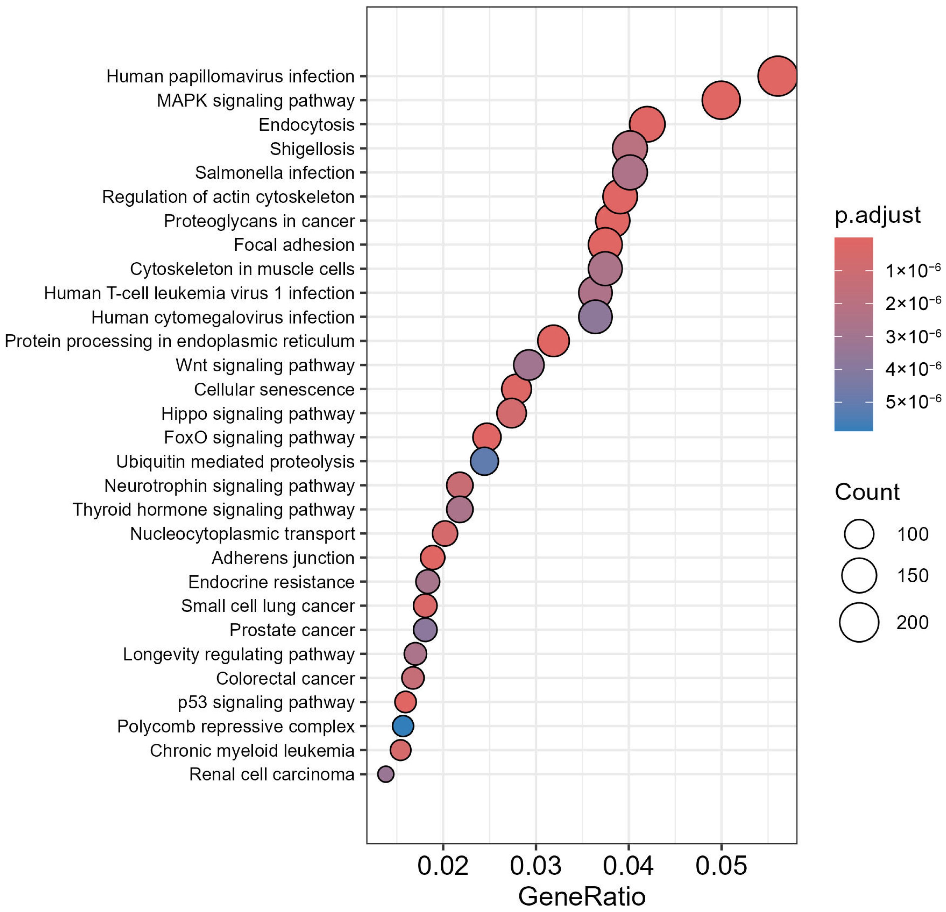 KEGG enrichment analysis of the combined target genes of miR-146a-5p, miR-9-3p, and miR-9-5p revealed significant associations with pathways central to inflammation, autophagy, and ubiquitination (p.adjust ≤ 5 × 10−6). The MAPK signaling pathway (p.adjust = 1 × 10−6), linked to IL6-driven inflammation and follicular dysfunction, was the most enriched, followed by ubiquitin-mediated proteolysis (p.adjust = 2 × 10−6), implicating miRNA regulation of protein degradation in ovarian aging (Figure 4). Pathways such as FoxO signaling (p.adjust = 4 × 10−6) and protein processing in the endoplasmic reticulum (p.adjust = 3 × 10−6) highlighted autophagy’s (LC3-associated) roles in endometrial stress responses. Notably, cellular senescence (p.adjust = 5 × 10−6) and p53 signaling (p.adjust = 5 × 10−6) tied miR-9-3p/5p to oxidative stress and apoptosis in ovarian follicles. IL6-associated pathways (e.g., focal adhesion, cytoskeleton regulation) were enriched (GeneRatio = 0.03–0.05), with miR-146a-5p targeting genes in endocytosis and proteoglycans in cancer, suggesting roles in immune dysregulation and implantation failure.