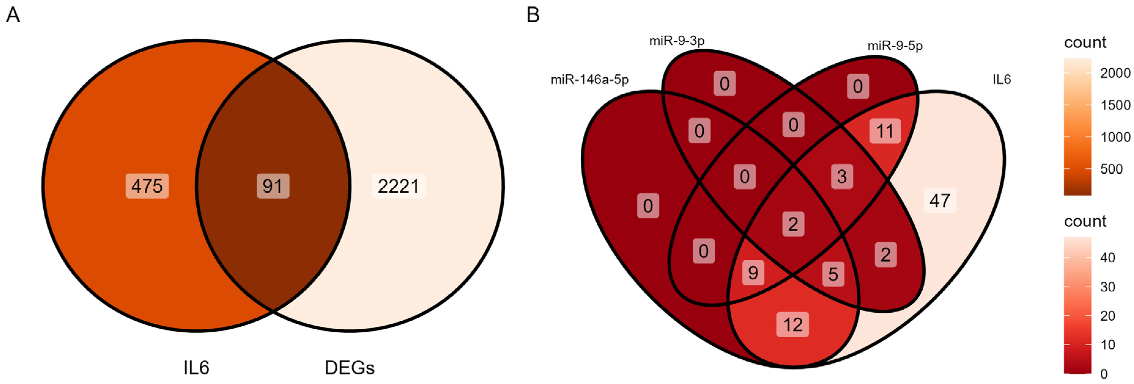 Figure 5. Interaction between DEGs, miRNAs, and IL6 signaling. (A) IL6 targeted genes in DEGs. (B) DEGs overlapped IL6 genes in miRNAs.