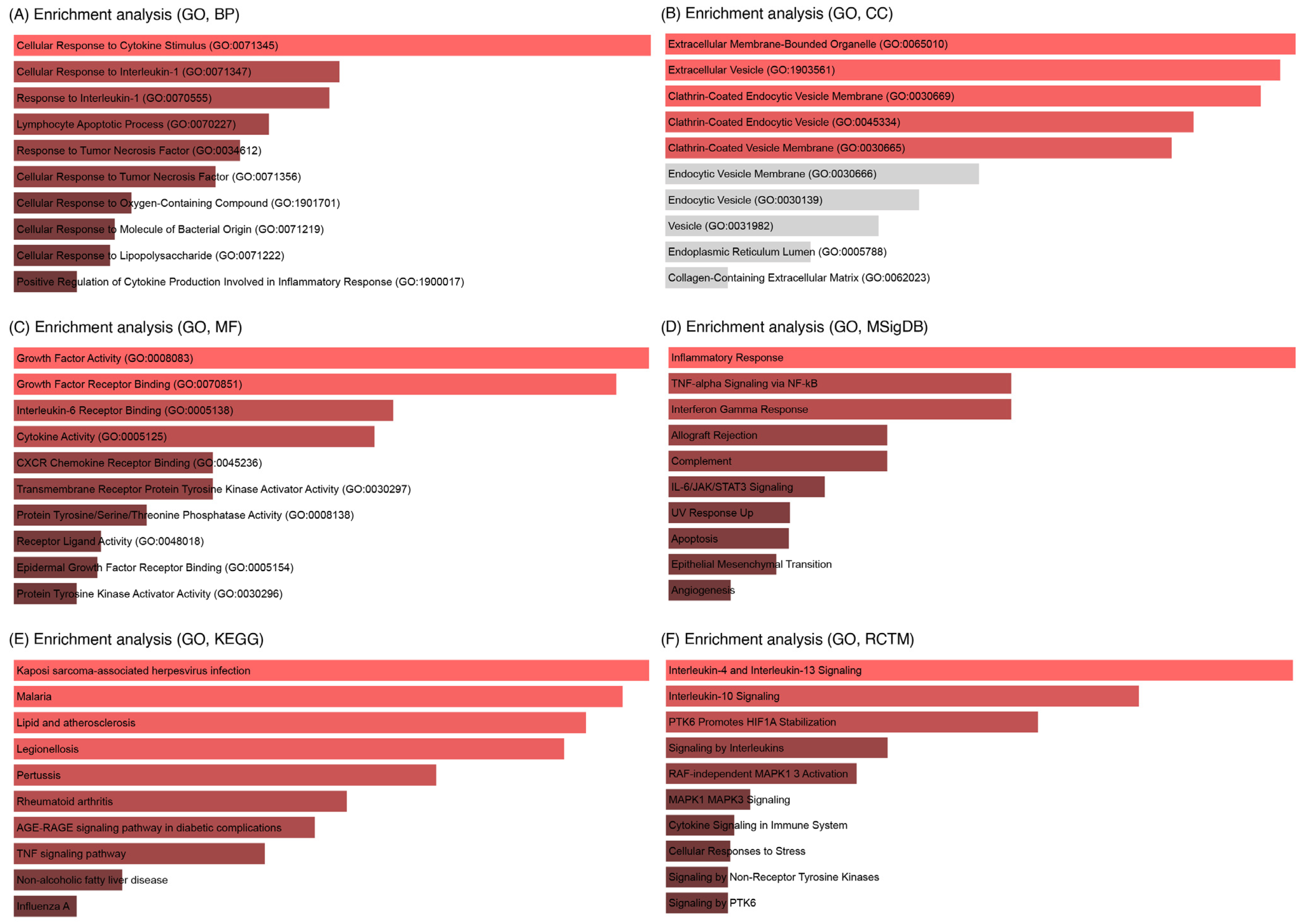 Figure 7. Key IL6 genes associated with apoptosis, female infertility, and miR targeted genes in enrichment analysis. (A) Biological process. (B) Cellular components. (C) Molecular functions. (D) MSigDB Hallmark pathways. (E) KEGG pathways. (F) Reactome pathways. Pathways were considered significant at p < 0.05 based on Enrichr’s statistical output.