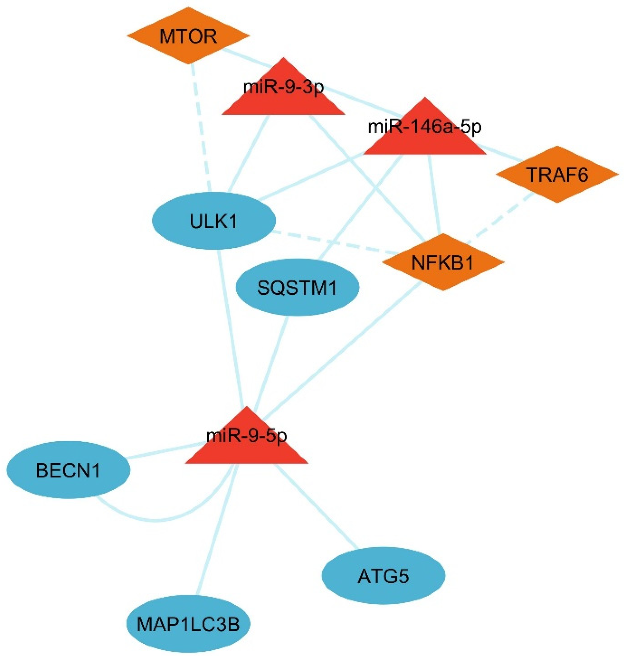 Cytoscape network analysis revealed miR-146a-5p, miR-9-3p, and miR-9-5p as central regulators of upstream autophagy and inflammatory signaling (Figure 9). The network highlights cross-regulation between autophagy (ATG5, MAP1LC3B) and inflammatory pathways (TRAF6, NFKB1), with miRNAs acting as molecular bridges. miR-146a-5p suppresses TRAF6 and NFKB1, dampening IL6-driven inflammation while indirectly promoting autophagy via reduced MTOR activation [60,61,62]. miR-9-3p targets MTOR by directly stimulating autophagy initiation through ULK1 and BECN1 [63]. Also, miR-9-5p regulates SQSTM1/p62, linking ubiquitination to autophagosome formation via MAP1LC3B (LC3B) [64].