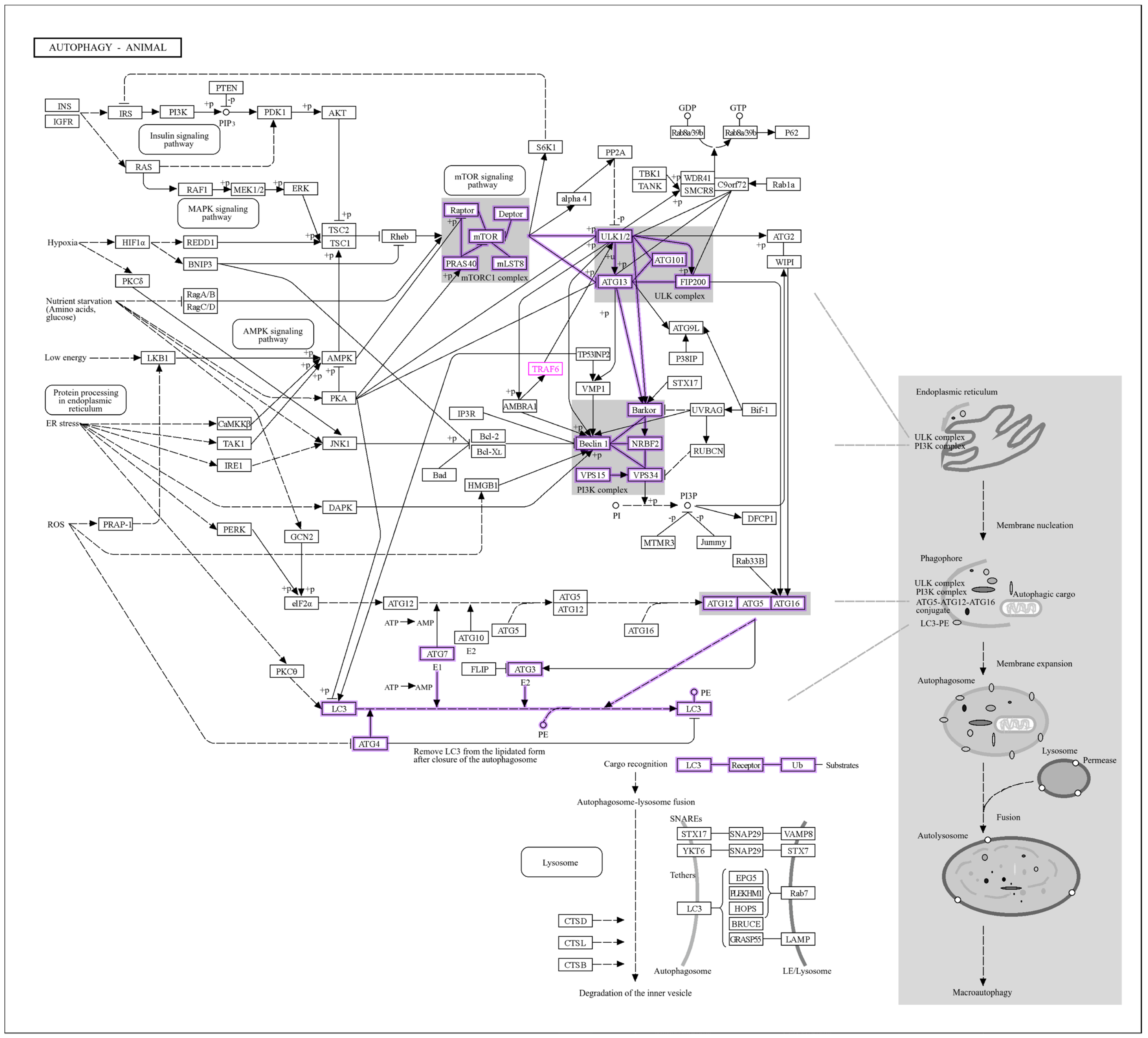 Figure 12. The KEGG autophagy pathway (nt06532). The core molecular machinery of macroautophagy, including the mTOR signaling pathway, which inhibits ULK1 and the LC3 conjugation system. Genes highlighted in purple (ULK1/2, Beclin 1, LC3, ATG5, ATG7) are key targets of miR-9-3p and miR-9-5p identified in this study, demonstrating their role in regulating autophagic flux.