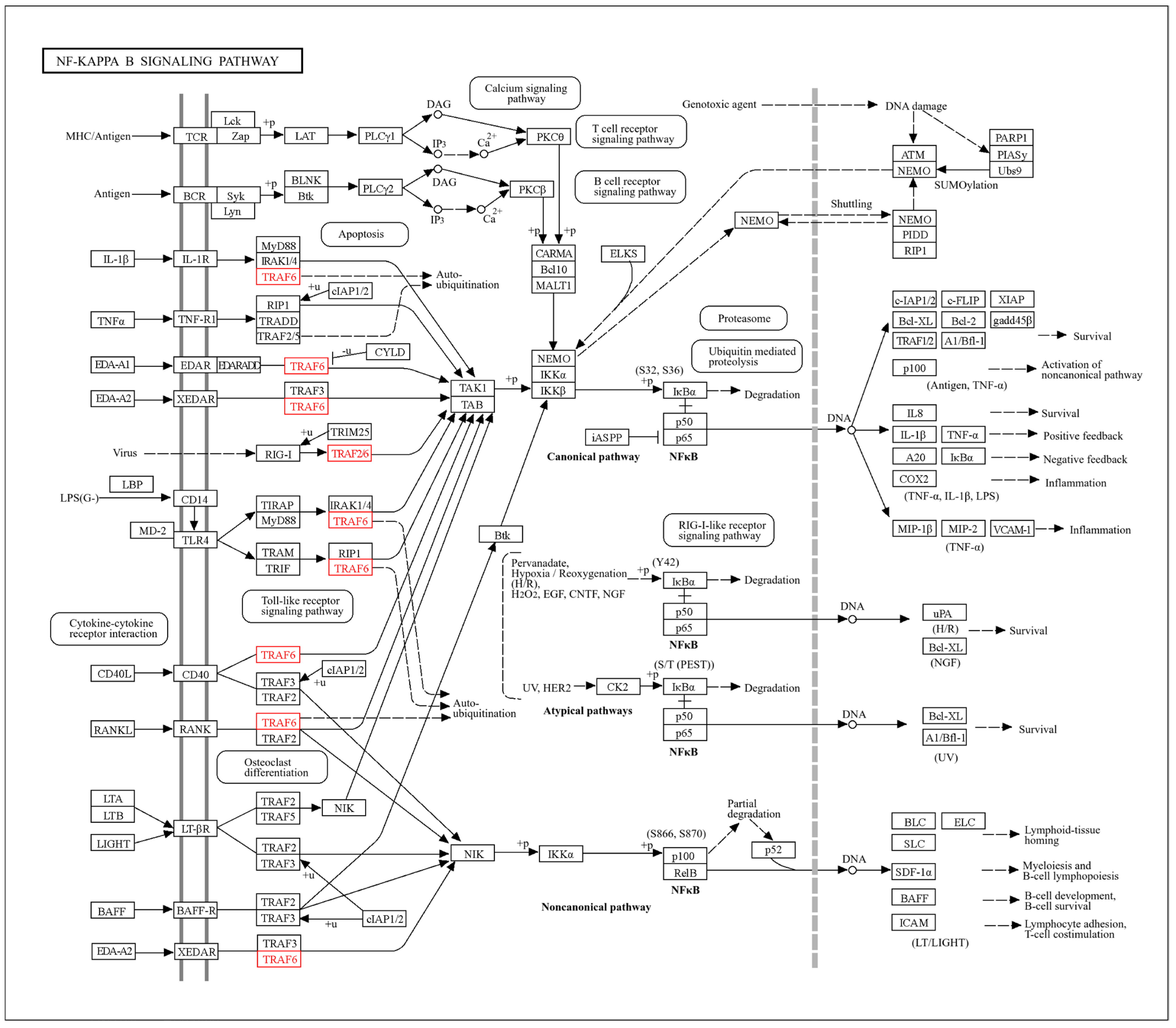 Figure 13. The NF-κB signaling pathway (nt06516). It depicts the canonical and non-canonical NF-κB activation pathways. Genes highlighted in red (TRAF6) represent key nodes targeted by miR-146a-5p, indicating their role in suppressing inflammatory signaling downstream of IL-6 and other cytokines.