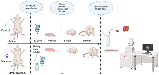 This study followed guidelines set forth by the Animal Welfare Act and the National Institutes of Health Guide for the Care and Use of Laboratory Animals and was under approval from the Sanford Research Institutional Animal Care and Use Committee (Protocol #170-06-23B and 153-10-21B). All animals (Sprague–Dawley rats) were housed in a temperature-controlled, light–dark-cycled facility with free access to water and chow (TD2018 Teklad, Envigo; 18% fat, 24% protein, 58% carbohydrates) throughout the experiment. Prior to breeding, female rats (10 weeks of age) received an intraperitoneal injection of 65 mg/kg streptozotocin (Sigma-Aldrich, Inc., St. Louis, MO, USA) to induce pregestational diabetes and the control rats received citrate-buffered saline (20 mM, Thomas Scientific, Swedesboro, NJ, USA). Female rats that did not manifest diabetes, defined as a blood glucose < 200 mg/dL within 48 h after streptozotocin injection, were excluded from the study. After confirming the induction of diabetes, female rats were bred with healthy male rats and monitored by daily vaginal swab for spermatozoa. When spermatozoa were first present, timed pregnancy started as embryonic day 0 (E0). With a goal to keep blood glucose levels at 200–400 mg/dL, dams were partially treated with sliding scale insulin (regular and glargine, Eli Lilly and Co., Indianapolis, IN, USA) two times per day. Whole blood sampling from a tail nick was performed to measure glucose at least twice daily and ketones (βHOB) daily (Precision Xtra glucometer and ketone meter, Abbott Laboratories, Abbott Park, IL, USA). Dams were allowed to deliver spontaneously to yield offspring of both sexes from two distinct groups: the control group and the diabetes-exposed group. After equalizing the litter size, the offspring were cross-fostered on P1 to normal-timed pregnant dams fed a control diet that had delivered 0–7 days prior to the corresponding experimental offspring. To ensure that exposure to diabetes was only prenatal, all pups were weaned to a control diet before being aged to the preset timepoints (3 weeks and 4 months). On P1, the 3-week, and 4-month timepoints, male offspring hearts were collected under 5% isoflurane anesthesia and stored at −80 °C until analysis. The scheme of experimental procedures is presented in Figure 1.